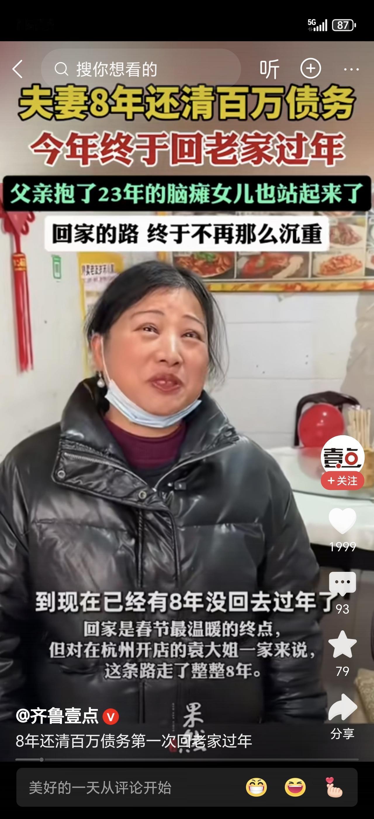 为还百万债,夫妻俩在外打拼8年没回家过年。今年,他们终于还清了最后一笔钱,买了最早的车票。攥着车票的手,一直在抖。 8年前,他们生意失败,背上沉重债务。咬牙关掉店铺,去了陌生的城市打工。丈夫同时做三份工,妻子省下每一分钱。他们约定:债不清,不回家。 最苦的时候,两人分吃一包泡面。但每月雷打不动,把大部分收入拿去还债。朋友的通讯录翻了又翻,最终还是没好意思开口借钱。8个春节,他们都在出租屋里默默度过。 当最后一笔转账成功的提示音响起时,夫妻俩抱头痛哭。这些年的辛酸、委屈,和对家人无尽的想念,全都化成了眼泪。他们第一时间,拨通了那个多年未拨的号码。 回家的列车上,窗外熟悉的风景越来越近。手里给爸妈和孩子买的礼物,显得那么轻,又那么重。他们知道,欠家人的陪伴,要用余生慢慢补回来。 为了一个目标长期咬牙坚持,是种什么体验?如果过年回家对你来说很不容易,是什么在支撑着你?欢迎在评论区分享你的故事。丈夫负债 负债千万打工人 丈夫负债累累 丈夫债务缠身