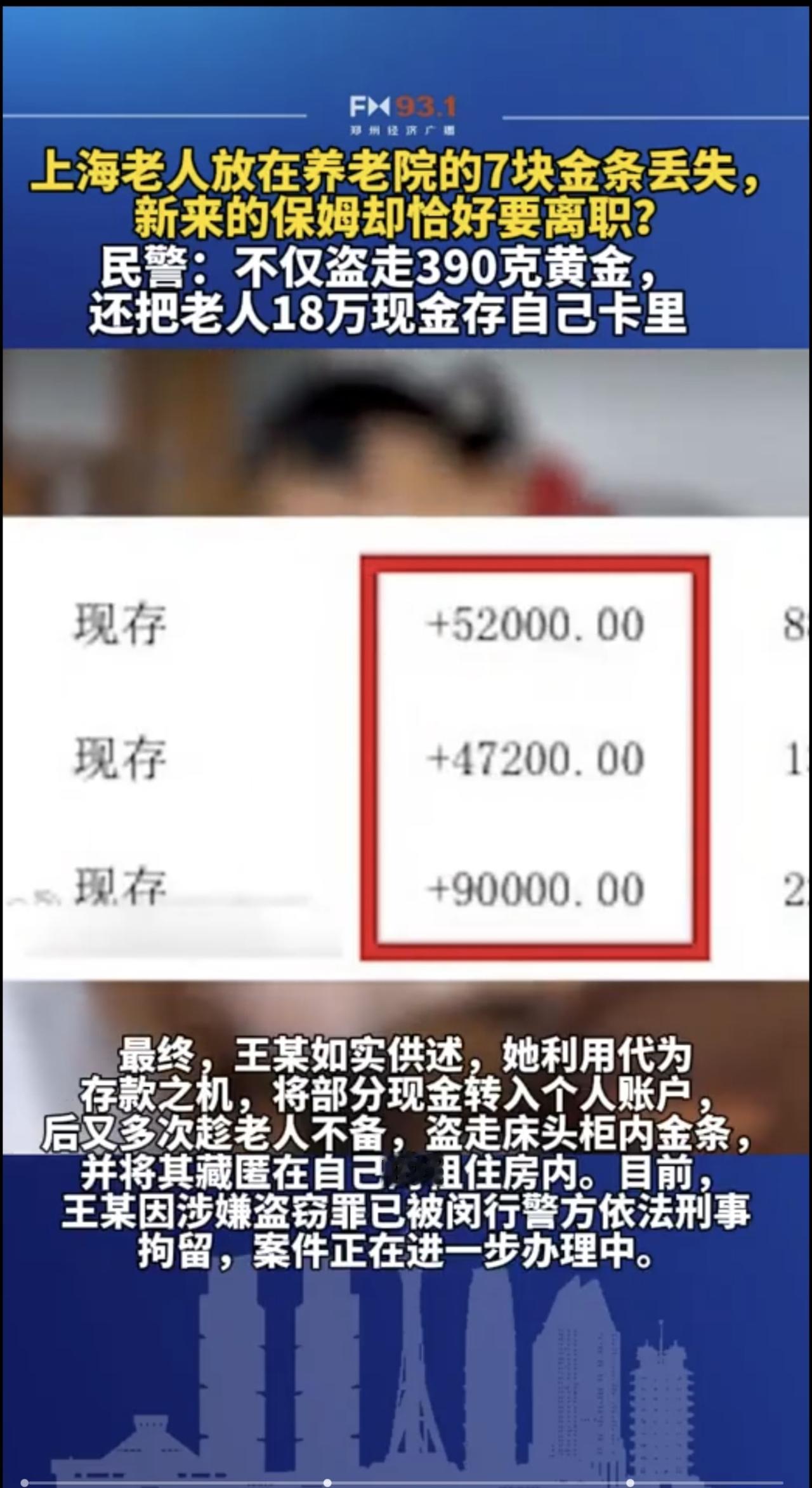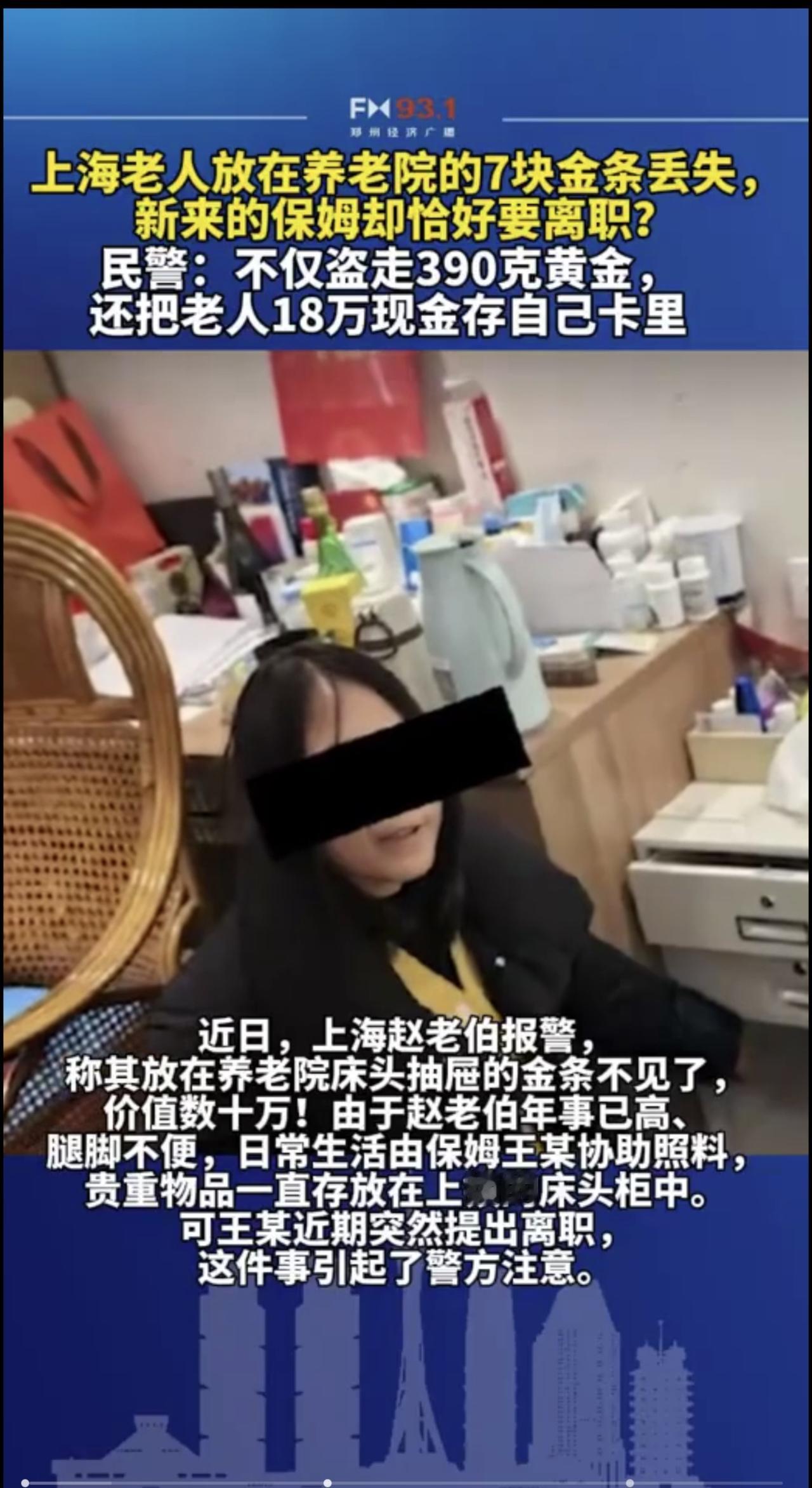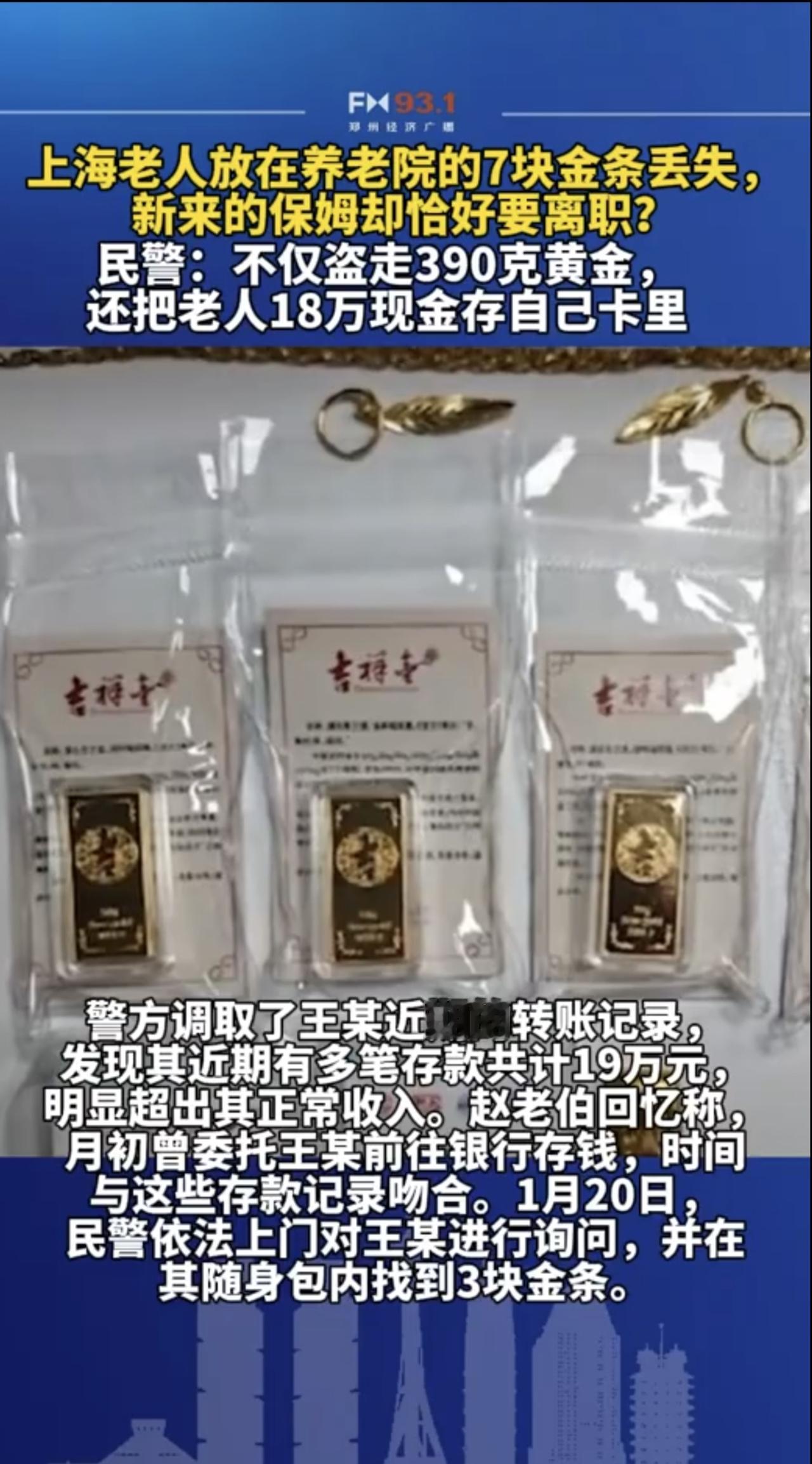 2月11日(发布),老人放在养老院的7块金条丢失,照料老人的保姆却恰好要离职?民警:不仅盗走390克黄金,还把老人18万现金存自己卡里。