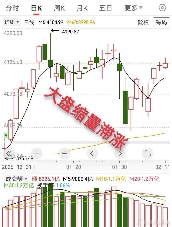 这一轮反弹,反弹之前是放量下跌,然后持续缩量反弹,目前反弹到压力位附近出现了很明显的缩量滞涨,没量,想继续向上很难了,所以,这个位置指数很容易直接砸下来,加上明天是春节长假的最后一个提现日,明天是完全有可能出现短线抛售情况的。