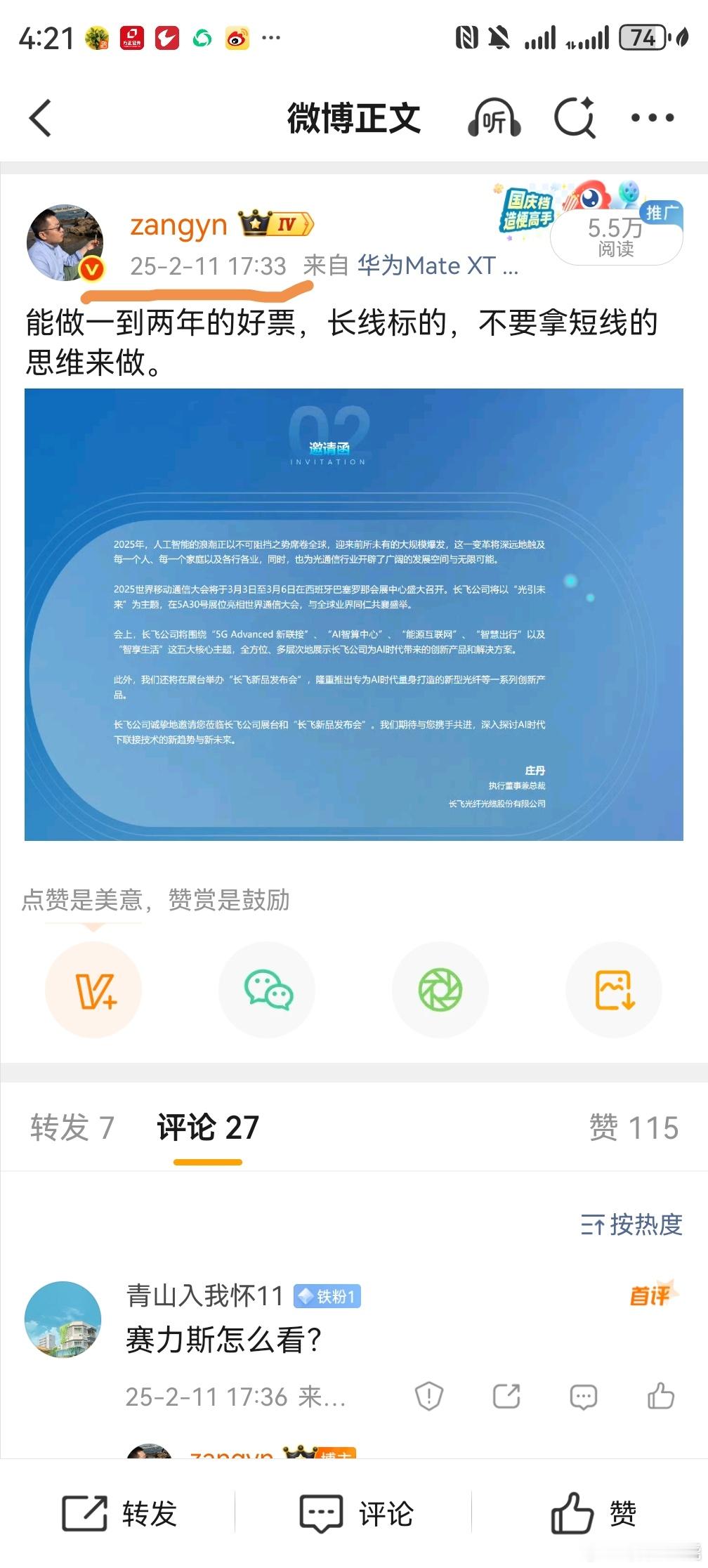 去年的这个时候推的长飞光纤,一年时间涨了七倍,明确表示,“长飞光纤是能做一到两年的好票,长线标的,不要拿短线的思维来做。 ”