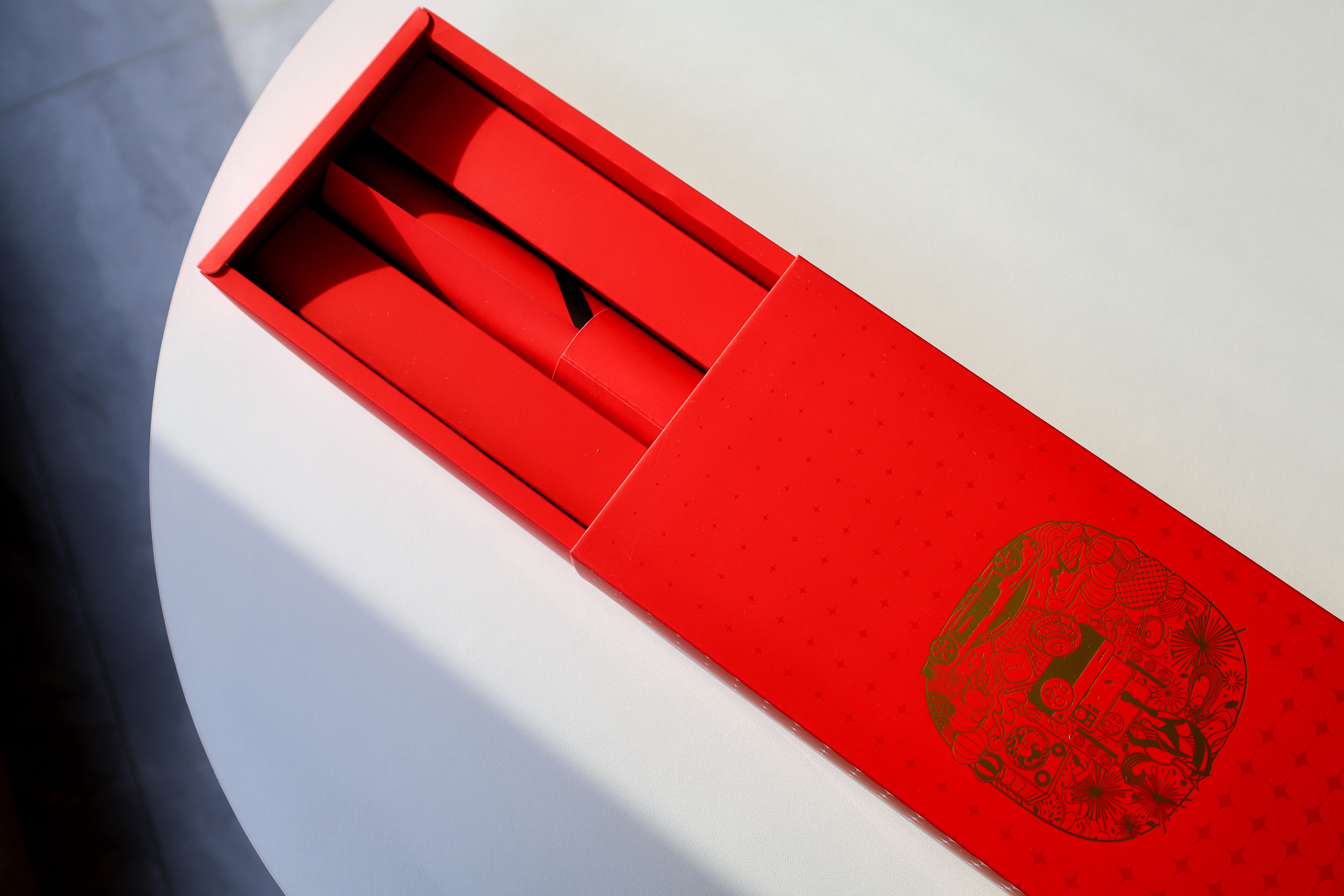 包装是一个黄色的吐司包,里面有定制的春联、窗花、红包,还有重量级的璀璨洋红配色的小米SU7 车模!