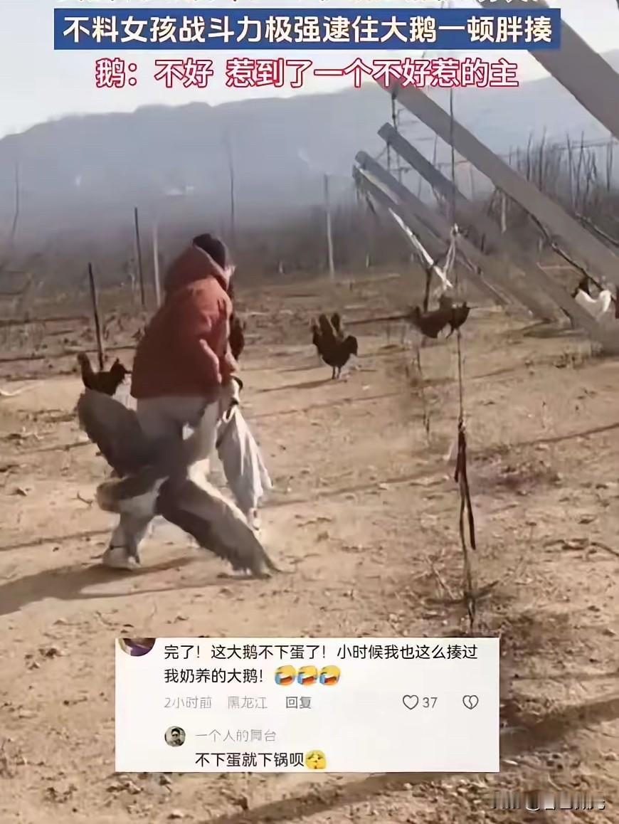 山东,一大学生放假回家,帮家里喂大鹅时,一只大鹅突然对女生发动袭击,没成想,女生不但没害怕,反而战斗力极强,直接把大鹅给打老实了,妈妈询问要不要把大鹅做掉,女生表示等把它打服再说。 这一幕,绝对够资格写进这个农家院的“野史”。 很多人可能不知道,在农村的江湖里,大鹅从来都不是普通家禽,而是实打实的“村霸”。论战斗力,它能稳压鸡鸭一头,连狗见了都得绕着走。脖子一伸、翅膀一张、嘎嘎一叫,那气势,普通大人都得慌。不少小时候被鹅追过的人,长大之后心里都还留着阴影,知道这东西有多不好惹。偏偏这次,它碰上了硬茬——一个放假回家、看似文静的女大学生。 谁也没料到,书本念得好,动手也一点不含糊。没有尖叫,没有逃跑,没有哭哭啼啼,女生当场就稳住了阵脚,几下就把这只横行惯了的大鹅治得服服帖帖。视频传到网上,很多人笑喷,说这是“大学生降维打击村霸”,也有人调侃,知识不仅改变命运,还能打赢大鹅。 玩笑归玩笑,这件事之所以能火,其实藏着不少现实的滋味。现在的孩子,尤其是城里长大、常年住校的学生,很多人一提到农活、家禽,第一反应是娇气、怕脏、怕累、胆小。可这个山东女生,直接打破了这种刻板印象。她没有因为自己是大学生就端着架子,回家该帮忙就帮忙,遇到突发情况也不矫情,该出手时就出手,冷静又干脆。 这才是最真实的当代年轻人。不是只会捧着手机,不是五谷不分,不是遇到一点小事就手足无措。他们受过教育,有知识,有眼界,回到家里,照样能接地气,能扛事,能处理连长辈都觉得棘手的问题。 再说说那只大鹅和妈妈的对话。妈妈心疼女儿,第一反应就是“要不要把它做掉”,一句话,藏满了护犊子的温柔。女儿一句“等把它打服再说”,更是让人哭笑不得,又觉得格外真实。没有一上来就赶尽杀绝,也没有忍气吞声,而是选择“以德服鹅”,用实力让对方服气。这种既不懦弱、也不极端的态度,反而透着一股通透。 农村生活本来就是这样,有鸡飞狗跳,有哭笑不得,也有藏在烟火气里的温暖。一只不服管的大鹅,一个战斗力爆表的大学生,一位心疼女儿的妈妈,凑在一起,就是最生动、最接地气的人间故事。 它不像电视剧那样刻意煽情,也没有什么高大上的道理,就是普普通通的家庭日常,却让人看得格外亲切。现在太多人喜欢追求精致、远离烟火,可真正动人的,往往就是这些不完美、有点搞笑、又特别真实的瞬间。一个年轻人,放假回家,不抱怨、不偷懒,帮家里分担,遇到麻烦自己解决,这本身就是一种很靠谱的成长。 大家笑的是大鹅被制服,感动的却是那份踏实、勇敢和家庭里的温情。 对于此事,各位怎么看?
