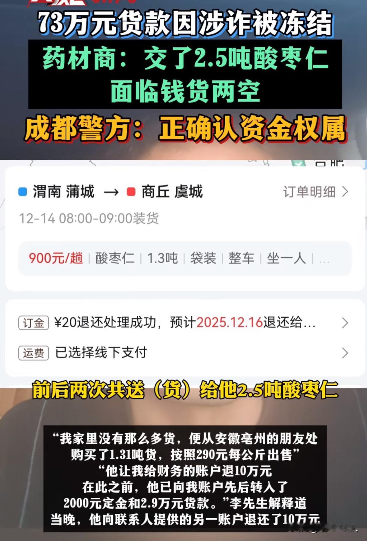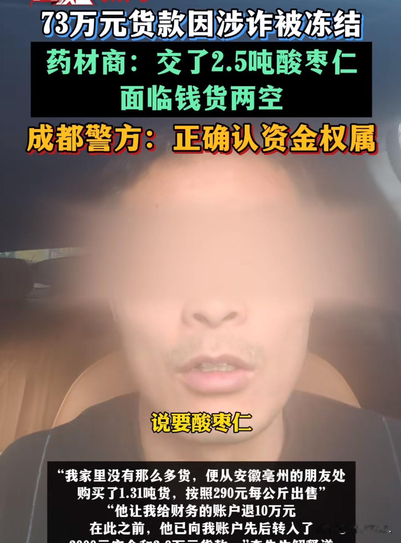 陕西渭南,男子做中药材购销的,有个大客户主动向他定2.5吨酸枣仁,财神爷找上门来,哪有不接的道理,男子掏空了库存,凑了1.25吨酸枣仁,又从朋友那里购买了1.31吨酸枣仁,一共收到73万货款。万万想不到,第二天去收购药材时,发现自己的账户竟然被外地警方冻结,还说这笔钱是诈骗资金,要返还给受害人。男子委屈的说:我哪知道他是诈骗犯啊、资金上又没写着诈骗资金,自己同样是受害人! 32岁的李先生,老家做中药材购销已有七八年,常年从药农手中收购酸枣仁、黄芩等药材,再批发出售。 近两年药材生意不景气,无奈之下,他也学起了在网上做短视频平台推广。 这个方法确实很奏效,很多客户都是通过短视频关注的他,在他这里下单。 让他的生意渐渐有了起色,也看到了希望。 然而,意想不到的一件事发生了。 2025年12月13日,一名自称河南商丘某药厂合伙人的男子,通过短视频平台联系到李先生,提出要采购1.25吨酸枣仁。 双方添加微信后,李先生赶紧把药材样品资料,出示给对方看对方确认品质,对方看后很满意,并且是个很爽快的买家,以每公斤280元的行情价成交,并约定货到付款。 12月14日,李先生亲自跟车,通过货拉拉将货物从蒲城送往河南商丘虞城县木兰镇。 15日晚买家验货无误准备卸货,提前向李先生转账30万元。 谁知,没过多久,李先生又收到同一账户转来的50万元。 就在李先生一头雾水的时候,对方随即致电称货款打错。 没等李先生说把这笔钱原路返回的时候,对方就大方的说让李先生再供应1.31吨酸枣仁抵扣多余款项。 这种好事找上门来,李先生欣然接受。 因自家现货不足,李先生特意从安徽亳州朋友处调货,以每公斤290元的价格成交。 对方还让李先生退还10万元至指定财务账户,在此前又转来2000元定金和2.9万元货款,李先生照做后。 12月16日,第二批1.31吨酸枣仁也顺利送达河南虞城。 两批货总计2.5吨,均为真实交易,两名货拉拉司机均可作证,车辆载重痕迹、送货照片都能证实货物足量,绝非空单。 李先生本以为钱货两清,还收获了长期客户,满心欢喜,可危机已然降临。 12月17日,李先生在山西收购药材准备转账时,发现两张银行卡全部被冻结。 经银行核实,账户是被成都市公安局温江分局刑警大队以涉诈资金为由司法冻结,被冻结的正是这笔交易的73万余元货款。 事后李先生翻看聊天记录才发现,12月15日退款时,微信多次弹出对方账户安全未知的反诈提醒,可他一心想维系客户,便没在意。 李先生怎么也想不通,自己正经卖货、真实交付,没有任何虚构交易和串通诈骗的行为,却莫名成了电诈链条的一环。 73万元货款被冻结,他身负上百万债务,需要结算药农款项、支付工人工资、偿还供应商货款,如今资金链断裂,催款电话不断,家人更是急得住了院,他几乎陷入绝境。 为解决问题,李先生积极配合警方,1月底疑似诈骗人员再次联系他采购药材,他立刻将线索上报成都温江警方,却被告知事发地在河南,当地无法管辖,仅能上报网安大队等待处理。 成都温江警方表示,涉案金额约80万元,资金均来自受骗群众,可能要返还受害人,建议李先生向河南商丘警方报警。 可河南虞城警方则称,资金由成都警方冻结,应找成都方面处理,无需在卸货地报案。 73万被冻结,外面又欠了一屁股债,李先生不知该找谁说理去,大喊太冤枉:自己又不知道对方是诈骗犯,上面又没写着诈骗资金,自己才是受害人。 这事曝光后,有网友唏嘘不已:你说神奇不神奇,这个钱在骗子账户上就不冻结,只要转到正常做生意的账户上,立时就冻结! 还有网友调侃:如果涉诈资金充了话费,电信移动的账户会不会被冻结。