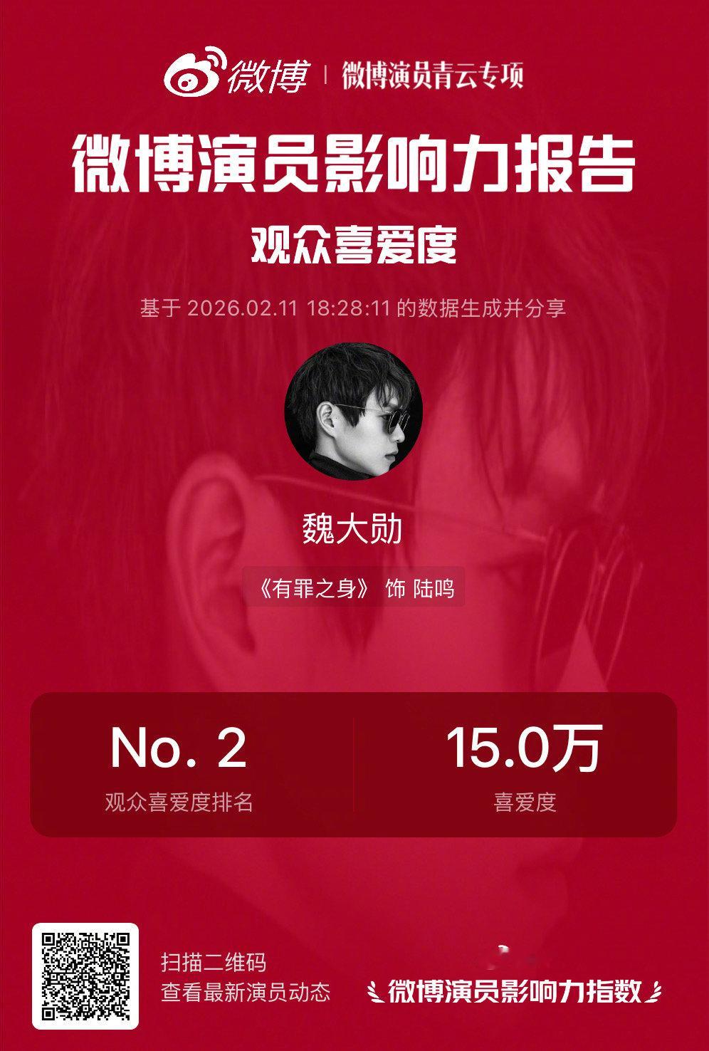微博演员影响力 观众喜爱度强势突破十五万!恭喜魏大勋陆鸣观众喜爱度破15万 🌟 以真诚演绎打动人心,以专业态度赢得赞誉。期待更多作品!直达👉 微博演员影响力指数