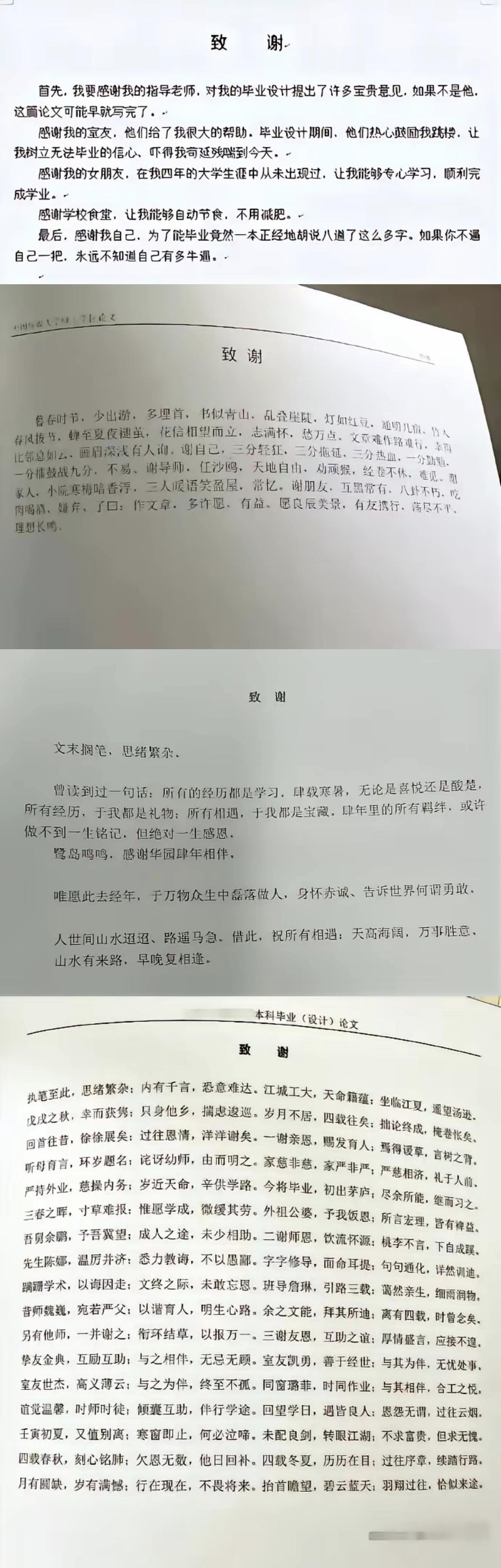 这都是些什么神仙论文致谢啊,被狠狠地惊艳到了,如今的大学生们真敢说啊也挺能说啊。 从这些风格各异的致谢节选中,可以看出论文致谢是学生个体成长的“诚实记录”。从感谢父母、导师到感谢食堂与文学、不存在的女友以及某A开头系列的日本女星等,致谢的内容不再拘泥于学术,而是拓展至构成大学生活的方方面面。 当代大学生在毕业论文这一严肃的学术环节中,巧妙地借“致谢”之口,完成了一次真诚、多元且极具个性的集体情感表达。 综合来看,这些风格迥异的致谢,是学子们在完成知识探索后,对自己青春岁月的一次深情回望与正式告别。在感谢他人与世界的字里行间,我们最终看到的是他们对自己的确认、对过往的梳理,以及对未来的期许。这或许是毕业设计中最具生命力的部分。
