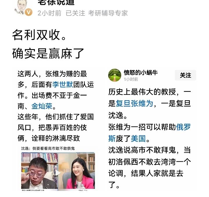 徐老师,和已经被封杀的jim博士一样,和很多公知一样,喜欢骂张维为, 为什么呢? 因为第一张维为在自媒体大V中,收入最高,是公知自媒体的眼中钉,容易引发公知及其粉丝的共鸣, 其二,张维为和黄教授不一样,从不拉黑粉丝,从不走司法途径,从不发律师函,所以公知大V,自认为骂他很安全, 其三,骂张维为有流量,可以挣到钱, 第四,张维为是吃爱国饭的,公知如果也吃爱国饭,可能吃不过他,不如另辟蹊径,吃点恨国饭, 所以,看上去众人大骂张维为,其实都是生意而已。