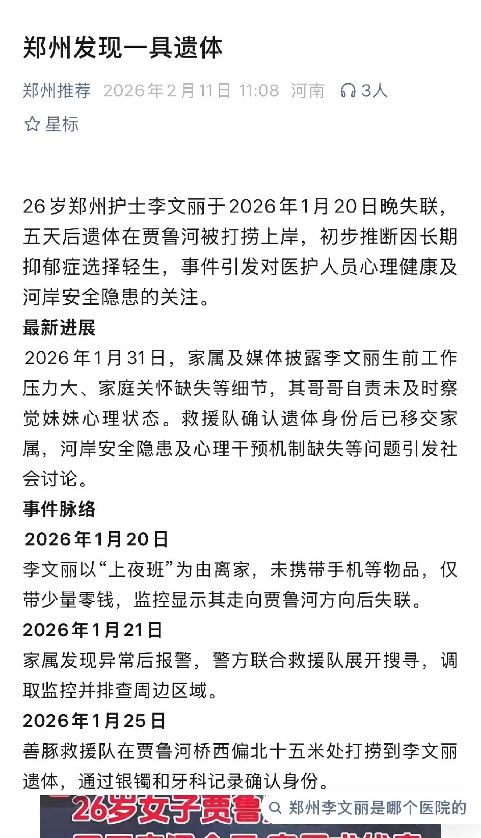 好难过!头一次发现,医护职业也是很难过的! 26岁郑州护士1月20号失联,五天后遗体打捞,初步推定为抑郁自杀! 忽然开始理解护士,病人投诉后,不管是正当理由还是不正当理由,受委屈的都是护理姐妹。 夜班本身就违背生物钟,连续夜班更是对身体甚至精神造成巨大危害! 护士长不行,病号不行,医院不行,原生家庭更不行,家庭是守住生命的最后一道防线。 医院待不下去,但是大环境差或者家人不让辞职,是好多护理人的现状吧? 对此,大家怎么看? 分享生活的随笔护士失联 医院 社会新闻