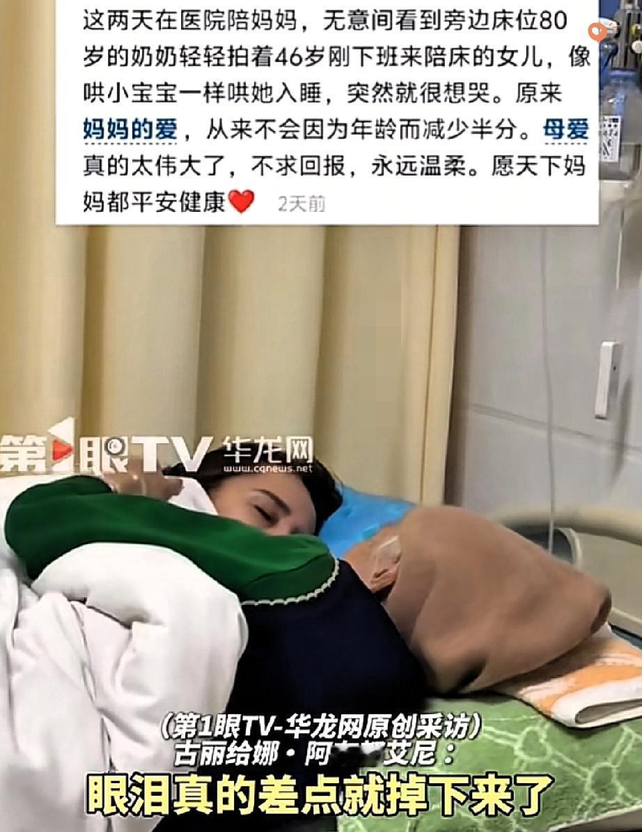 46岁女儿被89岁妈妈哄睡,这才是过年最戳心的画面。 新疆一家医院里,46岁女儿下班赶来陪护,累得趴在床边就睡着了。 病床上的妈妈明明自己也在养病,却舍不得叫醒她,伸出枯瘦的手,一下下轻轻拍着女儿的背,像小时候哄宝宝睡觉一样温柔。 这不是简单的照顾,是亲情最动人的双向奔赴。你守我年老,我疼你疲惫。 不管我们走多远、长多大,只要妈妈在,我们就永远有资格做回孩子。 妈妈的爱,从来和年龄无关,只和你有关。 你多久没被妈妈这样温柔对待了?是不是也瞬间想家了?