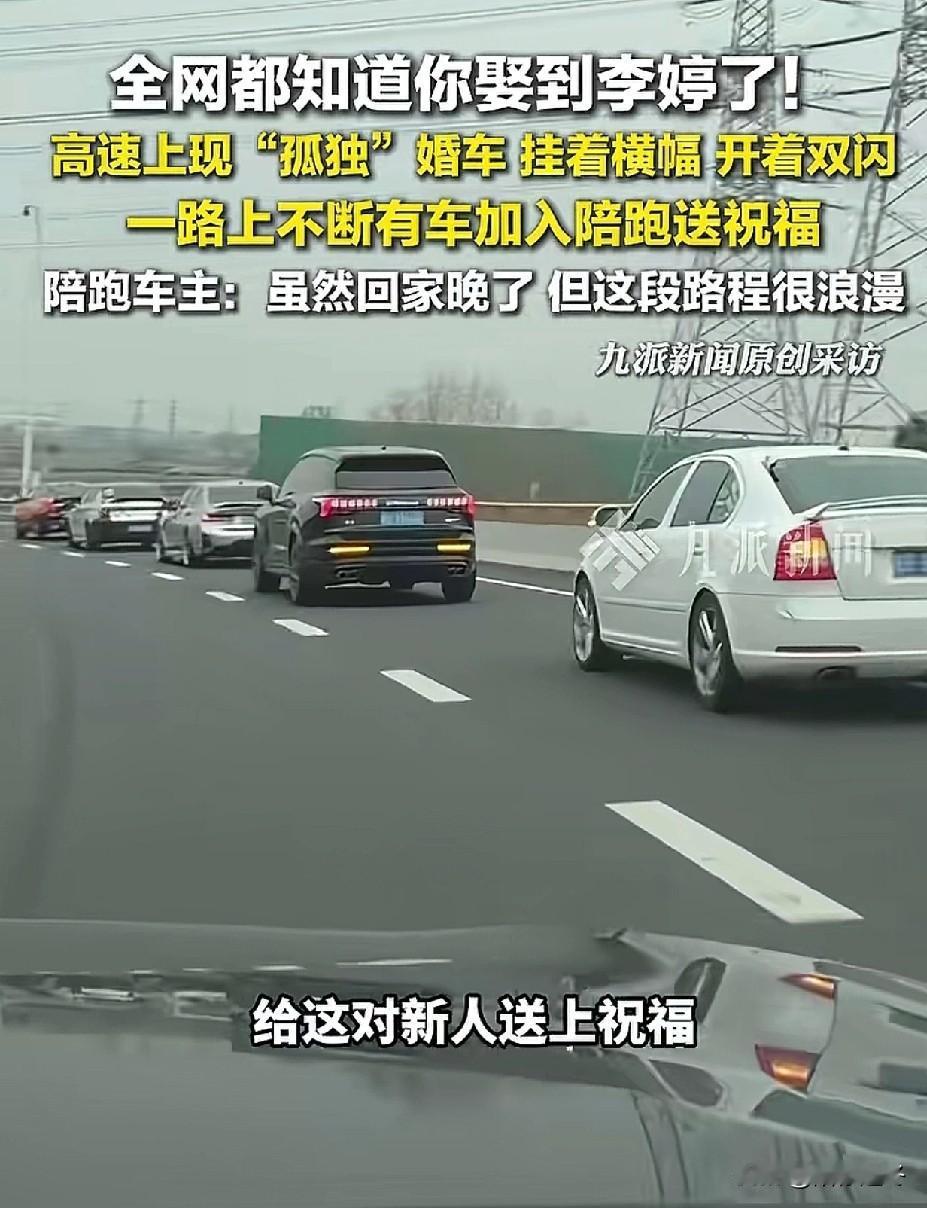 全网都知道你娶了李婷啦![鼓掌] 一个人开车,一个人接新娘,同行车友纷纷打开双闪加入迎亲队伍,拉着横幅的新郎和车队,成为高速上最靓丽的风景线,网友感叹:“远嫁并不孤单!” 2月11日,江苏无锡某高速上一辆婚车格外引人注目,婚车上拉着横幅写到“你怎么知道我把李婷娶到了”更是醒目! 据了解得知,新娘从上海远嫁到外地,因为路程较远,所以只有新郎一个人开车迎接新娘,但是这并没有影响到这对新人的喜悦之情,新郎特地拉上横幅,要把这份浪漫的爱情分享给所有的路人! 行驶过程中,陌生的车友也纷纷送上祝福,有的摇窗送祝贺,有的鸣笛示意,还有更多的人打开双闪直接加入迎亲大队。 其中陪跑车主董先生就其中一员,他随车队陪跑了100多公里,虽然回家晚了一点,但是这样充满爱,不一样的爱情旅程,让人幸福感爆棚! 不得不说现在的年轻人太有爱,太热情,对于素不相识的人,也会送上暖心的祝福![心]