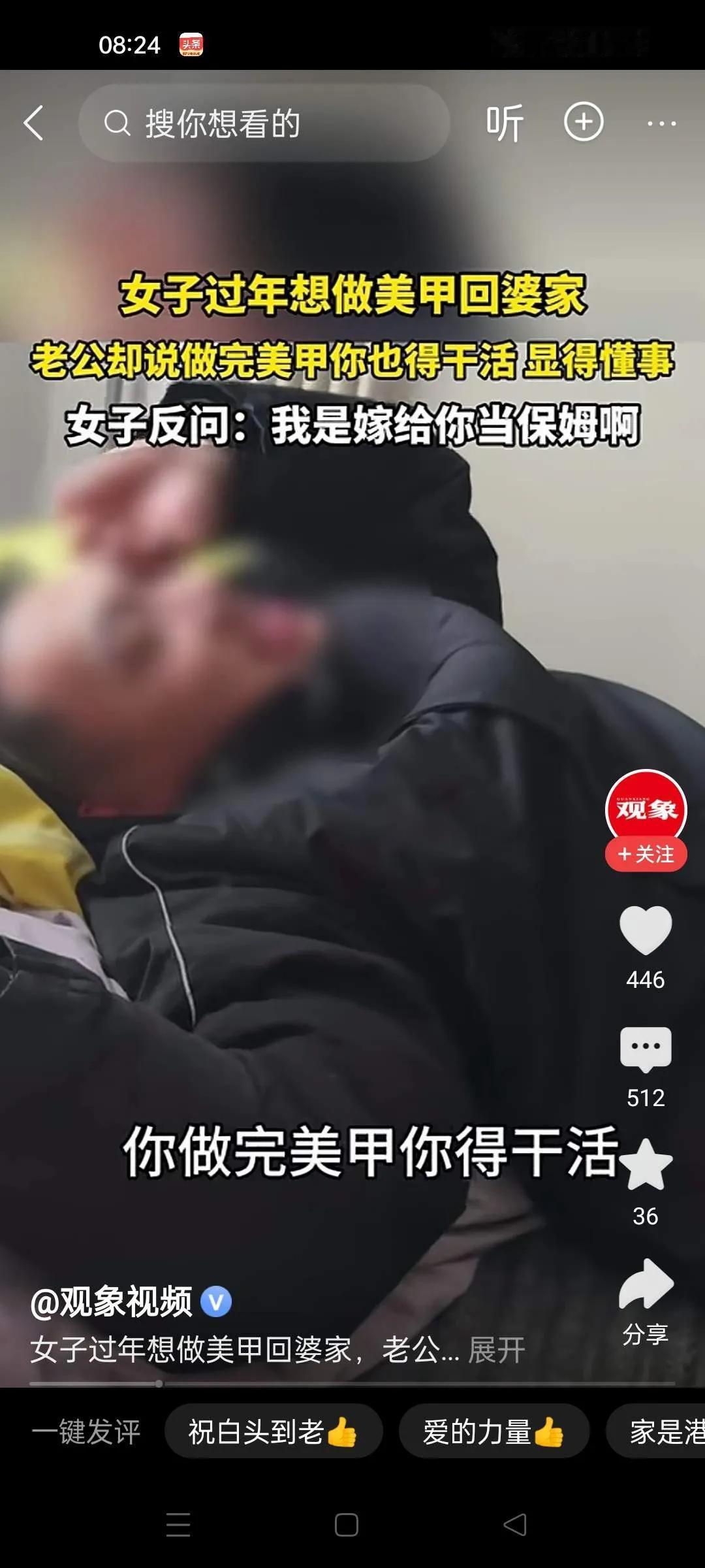 女子过年想做美甲回婆家。丈夫说你做了美甲你也要干活,显得懂事。女人说,凭啥啊?你
