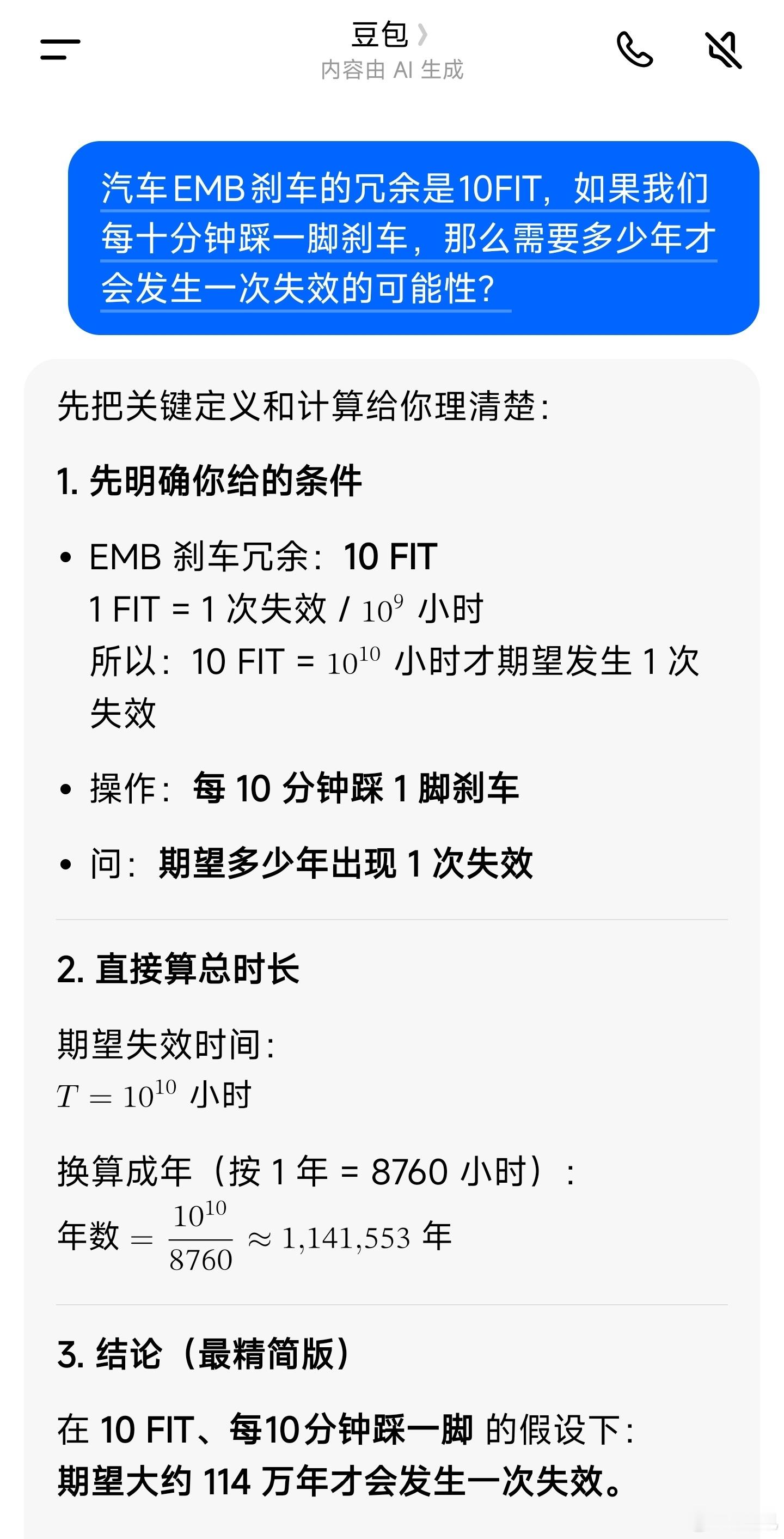 线控刹车EMB最近受到很多质疑,因为是线控,由电信号传递,电来建立压力,而不是过去的机械连接,所以有人担心失效。目前,几个做EMB的供应商做到的冗余是10FIT,也就是10的九次方分之一,如果我们一分钟踩一脚刹车的话,豆包帮我算了算(图2)。