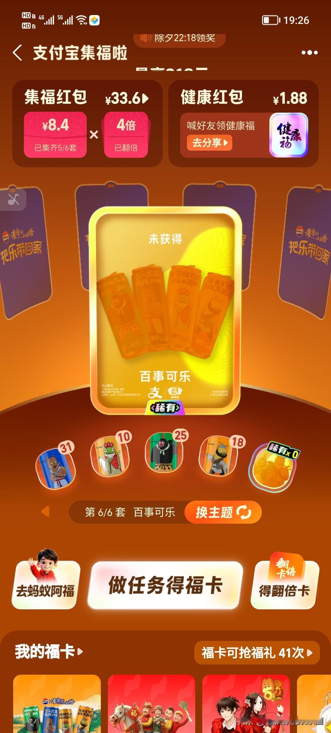 同时,我还获得了两张双倍卡,现在享受四倍红包收益,有33.6元了,比以往要好多了。 希望把最好一套卡也集成功,也希望能再获得几张双倍卡,让我高兴高兴。 朋友们,你们都集好了几套卡呢?