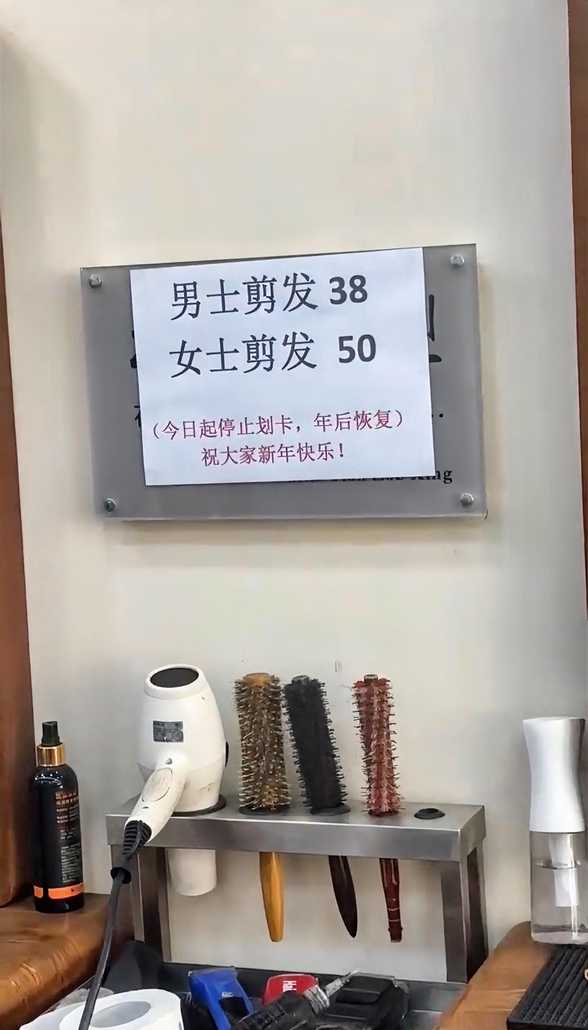 春节理发会员卡遭禁用,店里张贴通知今日起停止划卡,年后恢复。每年春节来临理发店一波涨价,春节理发多人手不够稍微涨价能够理解,之前冲的会员不让用是几个意思。男士会员会员剪头20,非会员30,春节男士剪头一律38,与平时会员价相差18元,挣钱有道这太离谱,谁给理发店的勇气。