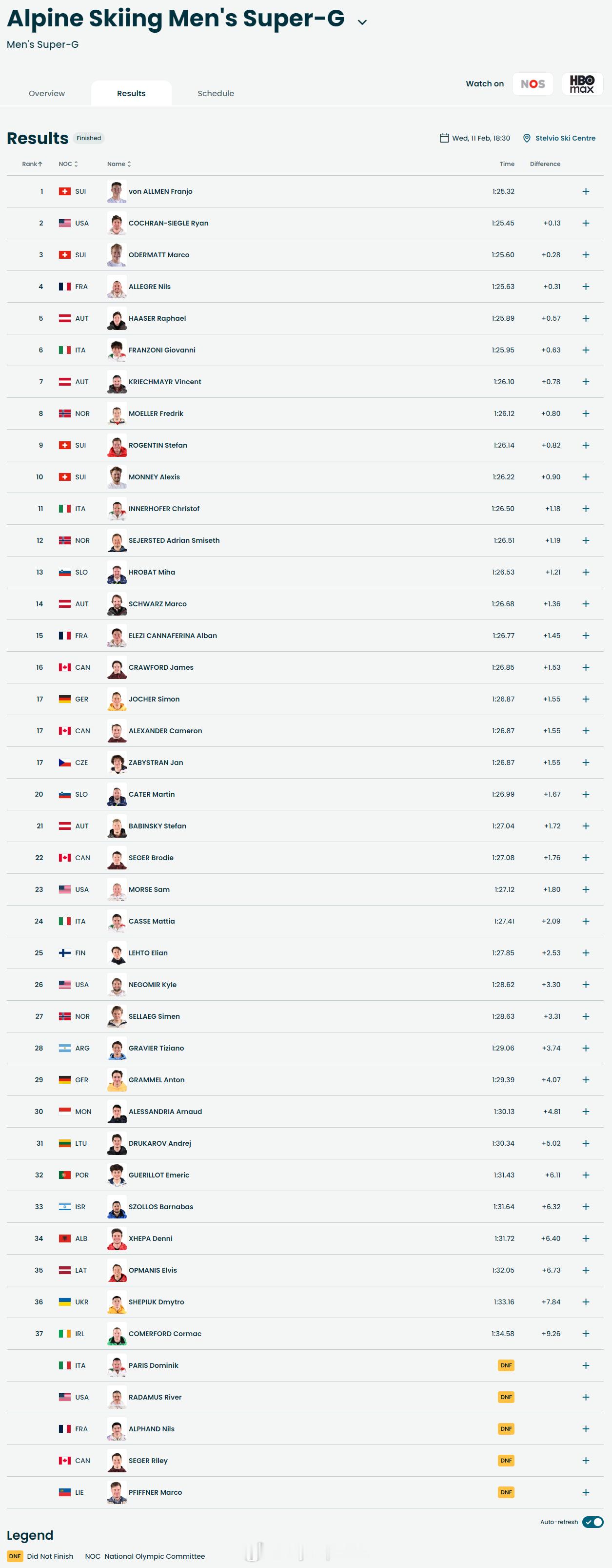 【冬奥高山滑雪男子超级大回转冯奥尔曼夺冠 加冕首位三金王】冬奥会 2月11日,冬奥会高山滑雪男子超级大回转比赛结束,本届冬奥首金得主、瑞士冯奥尔曼以1分25秒32夺得个人第三枚金牌,成为首位三冠王。美国科克伦-西格尔和瑞士奥德马特分获银铜牌。