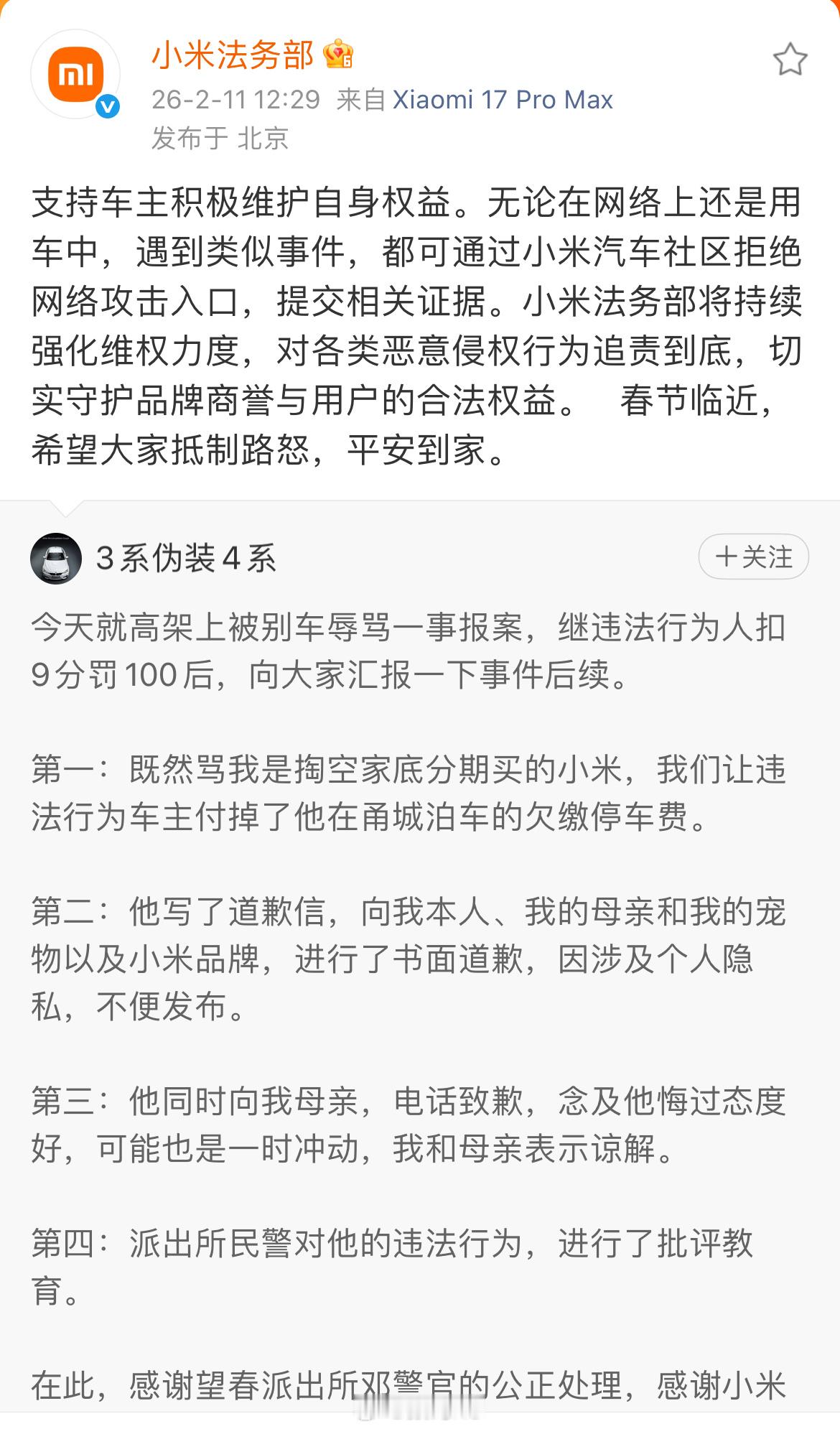 小米车主遭特斯拉车主别车辱骂春节临近,出行路上更要心平气和。针对近期路上恶意别车、言语辱骂等行为,小米法务部已发声,支持车主理性维权、合法维权。提醒各位车主:遇到此类情况切勿冲动,第一时间保留证据、及时报警,用法律保护自己和家人,也可向专业人士或小米法务部求助。临近春节,大家还是要好好开车。