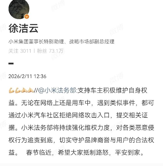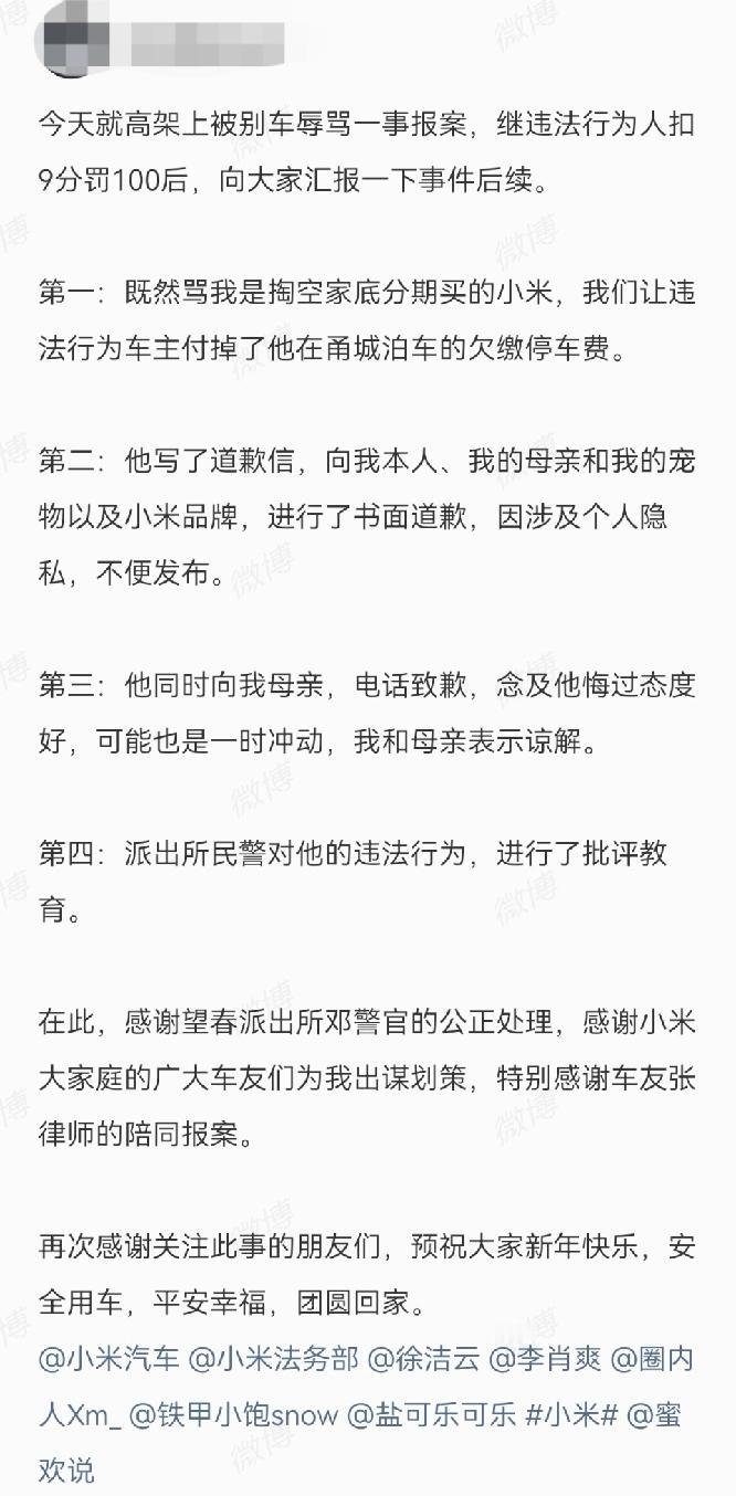 开特斯拉就这么牛吗?是嫉妒别人开小米?最后还不是赔礼道歉?小米是真宠粉啊! 小米车主被别车遭辱骂后续!处罚+道歉+官方力挺!小米YU7车主高架遭特斯拉恶意别车、被骂“掏空家底分期买小米”,事件最新后续来了!涉事司机被记9分、罚款100元,已书面道歉并电话致歉车主母亲,车主一方予以谅解。 2月11日小米法务部发声,全力支持用户维权,开通社区维权入口,将对恶意侵权追责到底,并呼吁文明驾驶、拒绝路怒!看得出,小米实力宠粉,也难怪这么多忠实米粉无论别人怎么黑小米,他们始终不离不弃。 再说了,你自己好好开车,干吗看着别人开小米就来气呢?