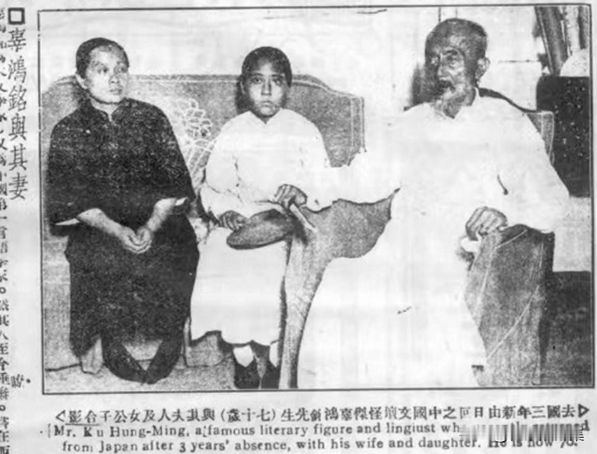 1926年12月31日出版的《北洋画报》第128期,登载了辜鸿铭七十寿诞(虚岁) 之际和妻女的合影。令人唏嘘的是,拍摄此照后仅三个多月,1927年4月30日,辜鸿铭便在北京黯然病逝。这张照片因此成为他生前最后一次,也可能是最重要的一次面向公众的、充满仪式感的家庭形象展示。