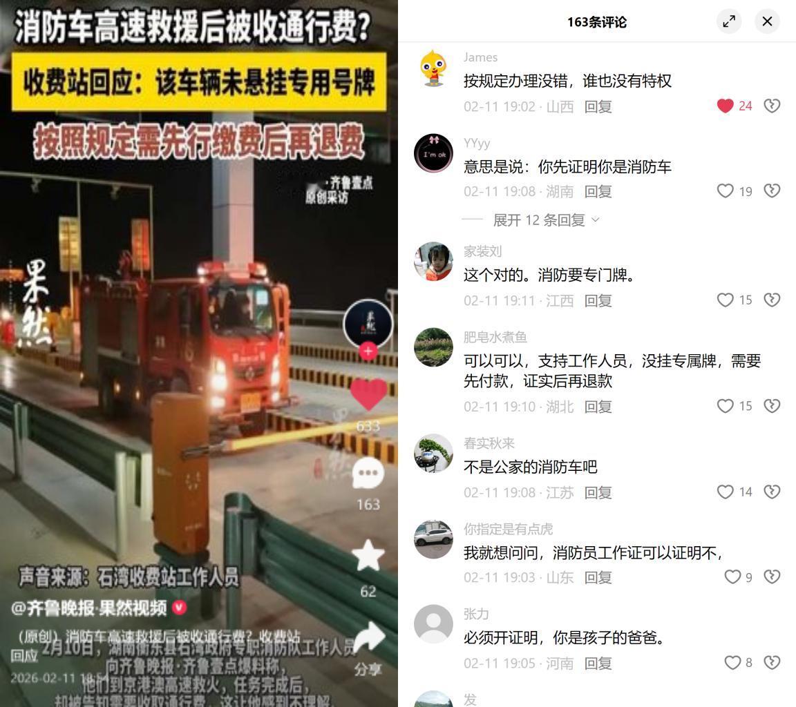 湖南专职消防车被收11元过路费 湖南衡东石湾的专职消防队,挂黄牌去高速救火,返程一开始被放行,后来却接到通知得补交11元通行费,再走退费流程。消防队不理解,收费站回应:他们没挂应急救援专用号牌,不在免单名单里,按规定得先缴后退。 这事哪是11块钱的争议啊,根本是消防队伍的身份鸿沟暴露! 国家综合性消防救援队是国家队,挂白底带应急的专用号牌,法定执行任务时免过路费、享最高优先路权。 可地方专职消防队是合同制,归地方相关单位管,车辆只能挂普通黄牌,连申领专用号牌的资格都没有,自然没法定的免通行费特权。 收费站的操作没毛病:不在提前报备的救援名单里,只能先按普通车收费,事后补材料走退费流程。 大家觉得按章办事就该这样,不能搞特殊;也有人吐槽这流程太折腾,救火还要回头证明我是来救援的? 说白了,这就是基层救援队伍的制度性困境。干着一样拿命换的活,就因为身份不同,连过路都要多走几道繁琐程序。规矩是死的,但能不能给一线救援多些灵活空间啊?