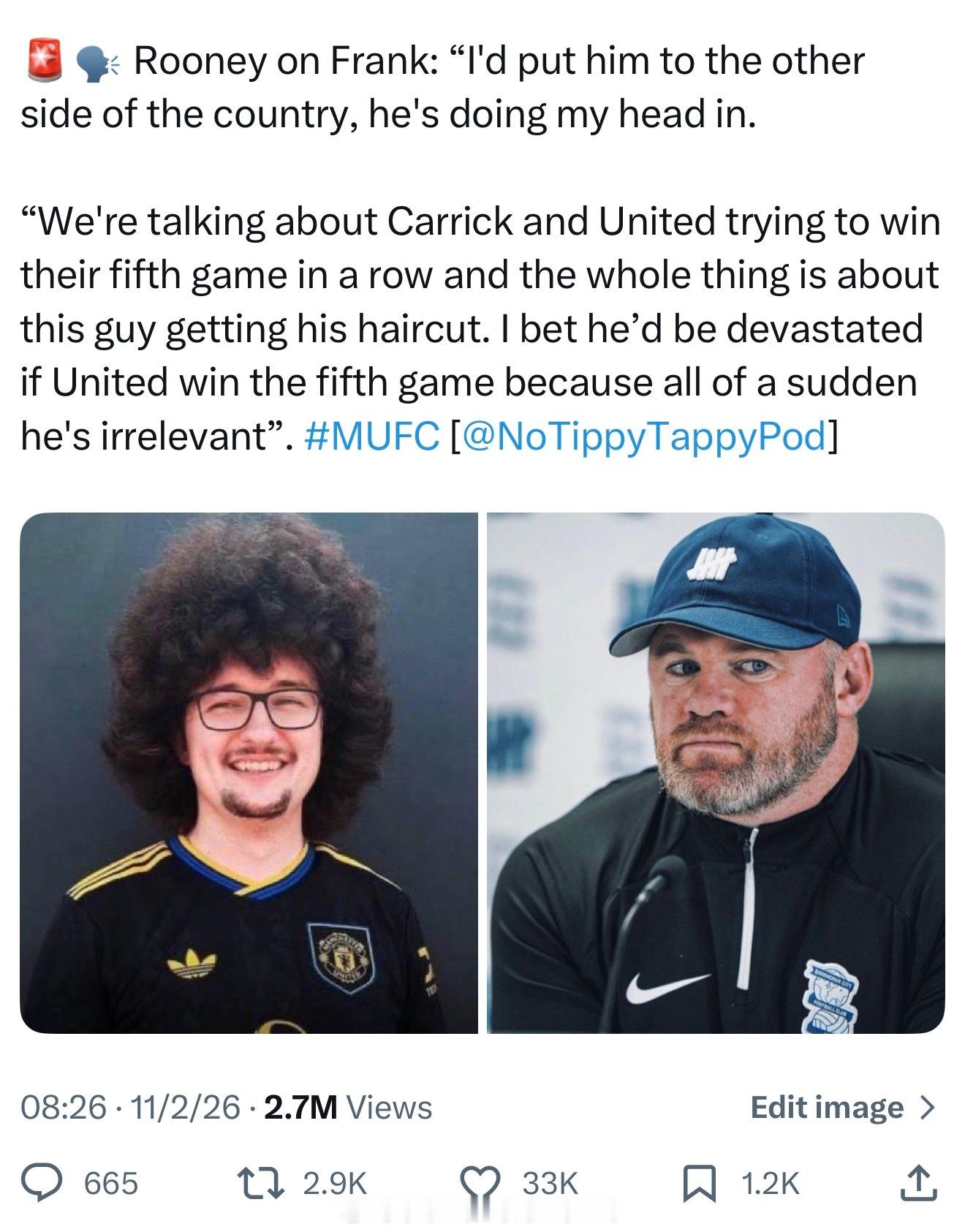 鲁尼谈曼联球迷理发哥:我们本应是在讨论卡里克😄带领曼联向着5连胜努力,而媒体和舆论却一直在讨论他如何理发。我保证如果曼联真得拿到5连胜,这人会非常失落,因为他不再被人关注。