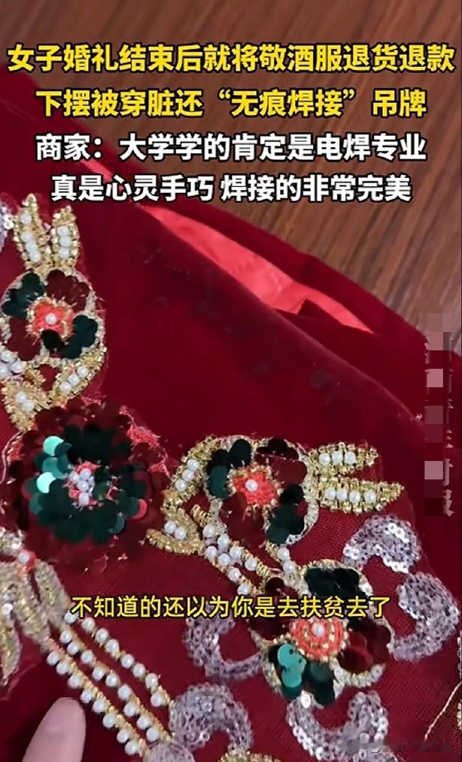 白嫖党上线!安徽一女子,婚礼结束后将穿脏的敬酒服退货退款,为了蒙混过关骗过商家的火眼金睛,对吊牌进行“无痕焊接”,商家调侃:大学肯定学的是电焊专业,心灵手巧,焊接得非常完美。 不仅全国网友没想到,就连商家也万万没想到,衣服吊牌剪下来之后,还可以进行无痕焊接,就问她是咋做到的? 2月10日,有山东商家曝光了一件离奇的事件,引发全国网友热议不断。 安徽一名新娘,将网购的敬酒服进行了退款退货,让年轻的男商家忍不住发视频揭穿,字字不带脏,但字字却诛心。 商家原话如下: “今天的这位新娘啊!大学学的肯定是电焊专业,你们看看这焊接技术怎么样?心灵手巧啊!焊接得非常完美,看看你嫁到哪里去了? 我不知道这个地方,你嫁得好不好?但是这个地方的路,肯定不好走,看把这下把造成什么样了?知道的以为你是在结婚,不知道的还以为你是扶贫去了!” 据商家展示的吊牌白纸黑字地写着: 1,请不要带妆试穿衣服。 这是为了防止脸上的化妆品,沾在衣领上,不好清洗。 2,试穿时请在床上试穿。 这是为了下摆被地面弄脏。 3,此吊牌一经拆毁,概不退换。 不拆吊牌,是为了方便二次销售。 然而,贪小便宜后的女子,既然无视商家的三条硬性规定,将敬酒后的脏衣服寄回商家,试图蒙混过关。 但凡是做电商的,哪里会这么粗心大意不检查就收货? 许多人一辈子就结一次婚,这得嫁了多穷的男人?穿过的敬酒服也妄想退点钱回去,这婚还不如不结。 商家的视频吐槽,字字不带脏却句句扎心:“知道的以为你在结婚,不知道的还以为你去扶贫了!” 女孩子的婚礼本该体体面面,却为了一件敬酒服丢了诚信,把小聪明用在贪小便宜上,实在令人唏嘘不已。 衣服脏了能洗,但诚信脏了,却难擦! 七天无理由退货,是保障消费者权益的福利,不是别有用心之人的“白嫖”工具。 某些爱占小便宜的人,实则是输掉了人品与底线,这样的行为真令人不耻! 你身边也有像这样的白嫖党吗? 内容来源于《第一现场》