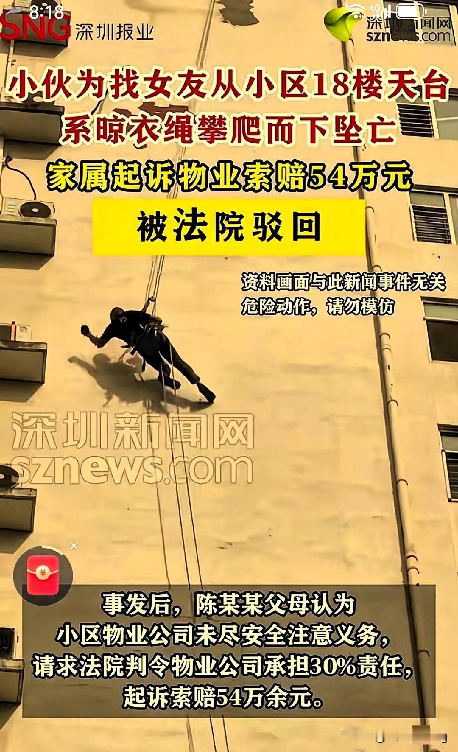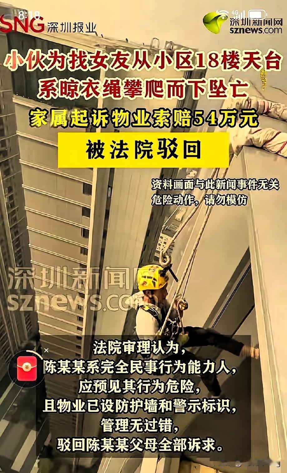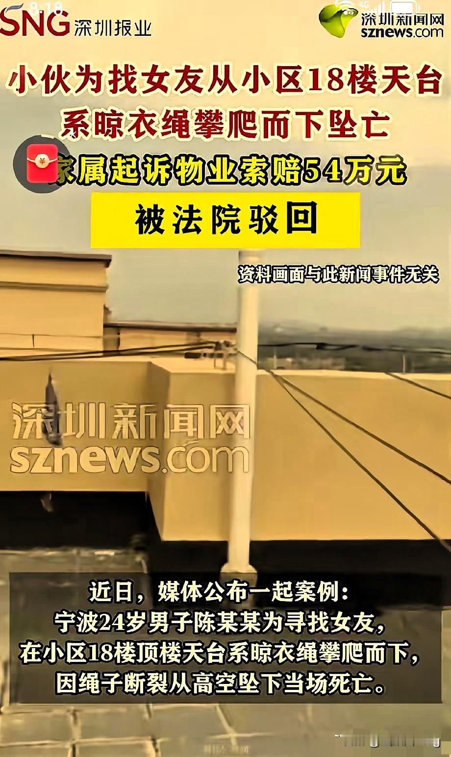 不是谁死谁有理!宁波这起判决,太让人解气了。 24岁男子为见女友,不走正门偏要在18楼天台用晾衣绳绑腰往下爬,绳子断裂坠亡。父母悲痛可以理解,可转头就把物业告上法庭,索赔54万,这实在让人难以认同。 法院判得明明白白:物业防护墙达标、警示齐全、天台门为消防畅通保留,已经尽到全部责任。一个成年正常人,理应清楚高空攀爬的致命风险,主动冒险的后果,只能自己承担。 法律讲情更讲理,从来不是“谁弱谁有理、谁死谁有理”。成年人最该守住的底线,就是为自己的生命负责。 你支持法院这个判决吗?你觉得成年人该不该为自己的危险行为买单?