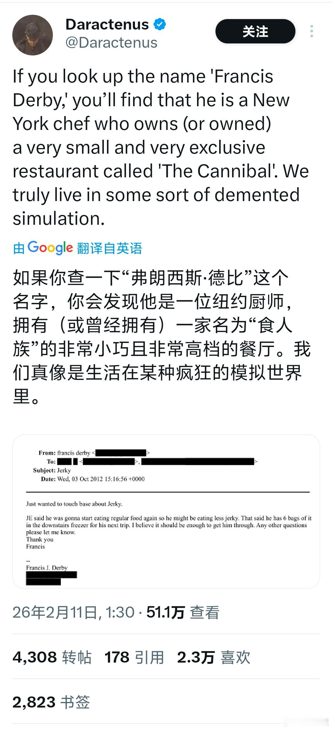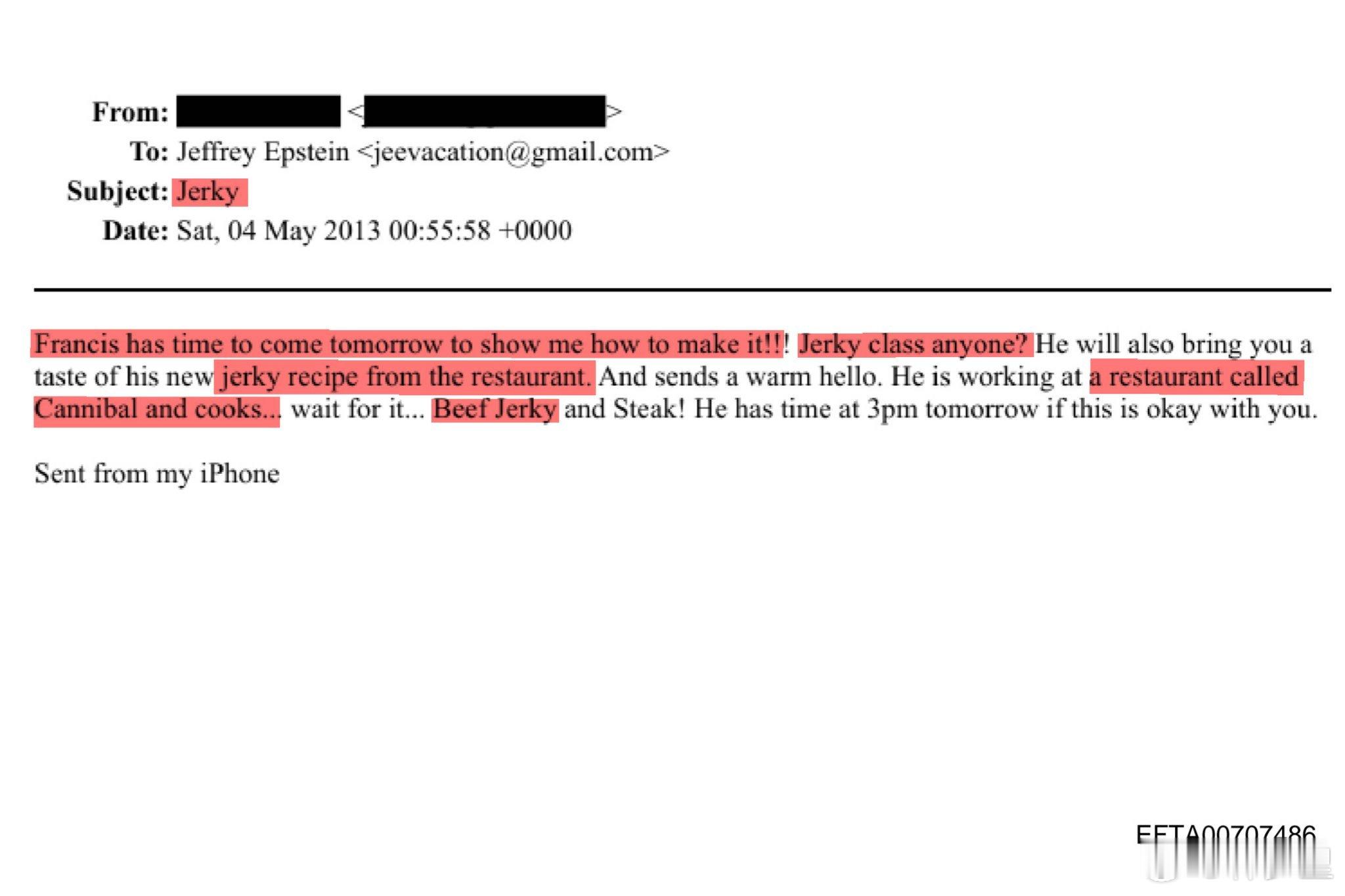 直到爱泼斯坦档案曝光……邮件里提到厨师曾在食人餐厅工作……