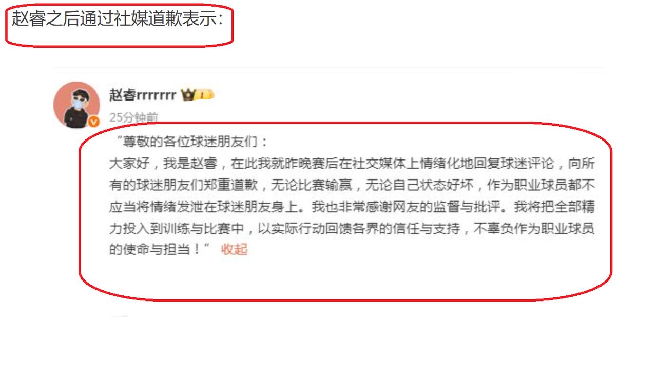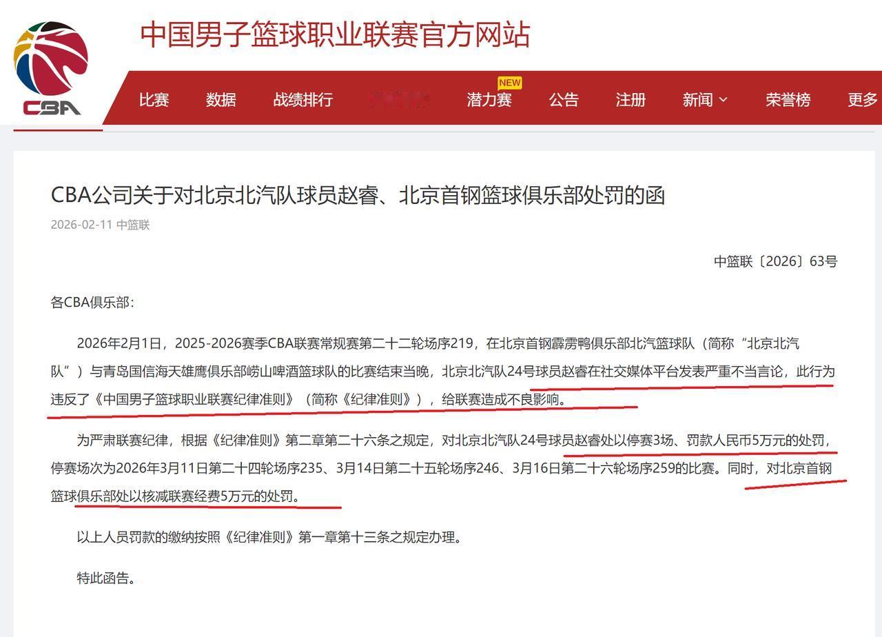 晚上9点!CBA公司给赵睿开出大罚单,北京队也被罚款5万 刚刚,CBA公司开出了一份大罚单,对北京队球员赵睿进行停赛3场+罚款50000元的处罚,与此同时,还对北京队也是进行罚款50000元。 在10天前,也就是2月1日,北京队与青岛队的比赛,在比赛的最后时候,北京队主力后卫赵睿出现了2罚不中的情况。赵睿罚球的连续打铁,也让北京队失去了追平比分的机会,最终,北京队以87-89输给了青岛队2分。 在赛后,有新疆队球迷,对赵睿的表现进行了吐槽,表示赵睿的篮球职业生涯,已经过了巅峰期。同时,还表示北京队本赛季想要夺取CBA总冠军,几乎是不可能。 面对球迷如此吐槽,输掉了比赛的赵睿,也是十分生气,十分气愤,于是,与就球迷在网络上吵了起来,并且,在言语方面,还是十分激动,同时,还说了一些不应该说的话。 后来,赵睿也是认识到了自己的问题,于是就通过网络平台,向球迷进行道歉,表示自己在输掉比赛之后,情绪化地回应了球迷的评论,很不应该,特地向球迷进行道歉!自己作为一名职业篮球运动员,不管是任何情况下,都不能够将自己的情绪发泄到球迷身上。接下来,自己也会反思,会将所有的精力用在训练和比赛上,同时,也是感谢球迷的监督和批评。 针对此事,CBA公司后面也是进行了调查,并且,认定赵睿在网络平台上,发表了严重的不当言论, 违反了CBA联赛规则,对CBA联赛造成了不良影响。 根据CBA联赛的规则,对赵睿进行罚款50000元+停赛3场的处罚。也就是说,CBA第二阶段,前三轮比赛,赵睿就无法参赛了。 与此同时,CBA公司还对北京队也进行了处罚,核减北京队联赛经费50000元! 实话实说:从赵睿与球迷的争论所言来看,真的是不合适,有一些话,完全就没有经过大脑,完全就是胡说,乱说。此番,CBA公司对赵睿开出大罚单,也是希望赵睿能够自律,自爱!希望他能够引以为戒。 值得一提的是,目前,赵睿正在参加中国男篮的训练,接下来,会代表中国男篮参加世界杯预选赛,在此,也是希望赵睿能够放平心态,在世界杯预选赛中打出好的表现。