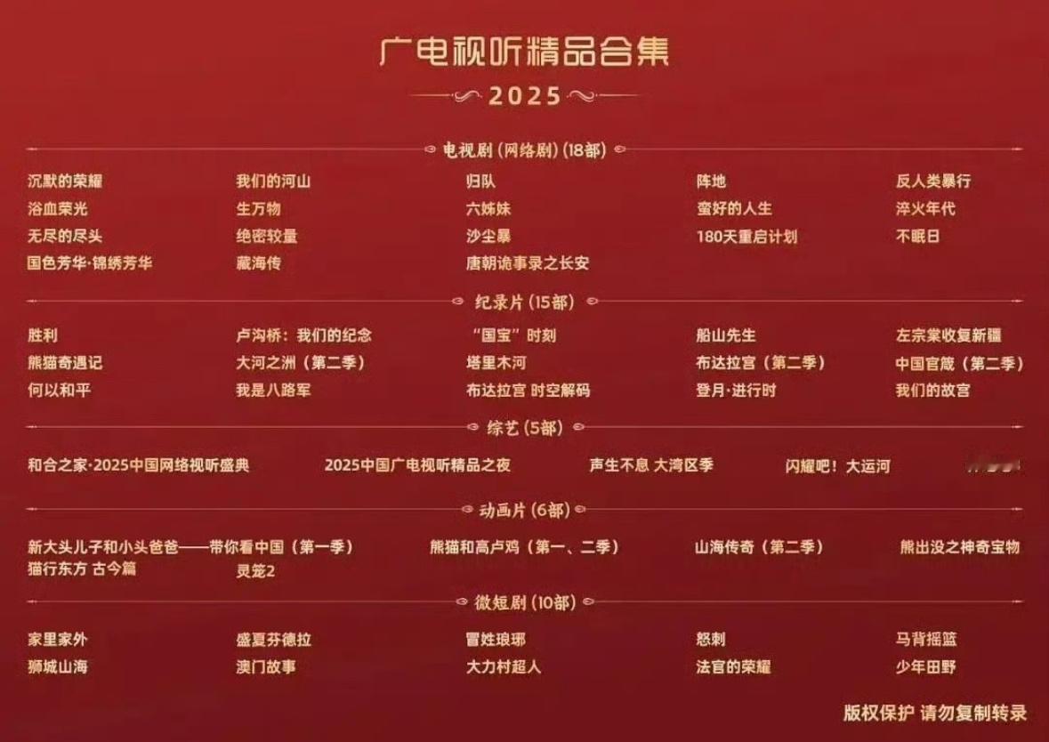 2025广电视听精品合集发布:电视剧:杨幂生万物 杨紫国色芳华 白敬亭不眠日 张新成淬火年代 纪录片:赵丽颖布达拉宫