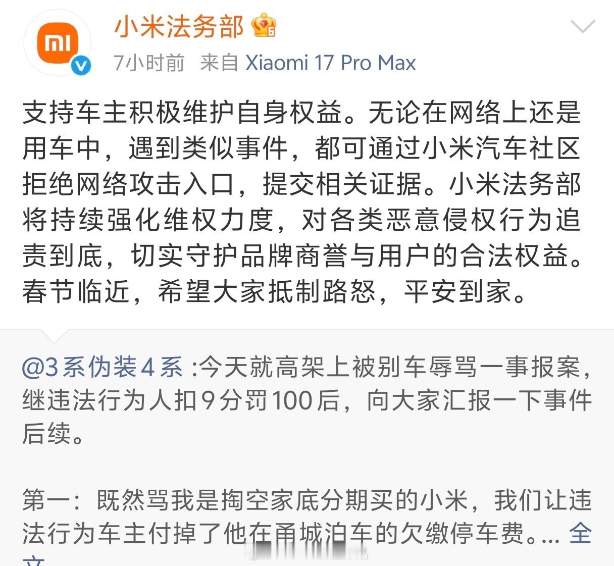小米为被别车辱骂车主发声而小米做的最对的一件事,就是坚决维护车主,帮助车主维护自身权益。