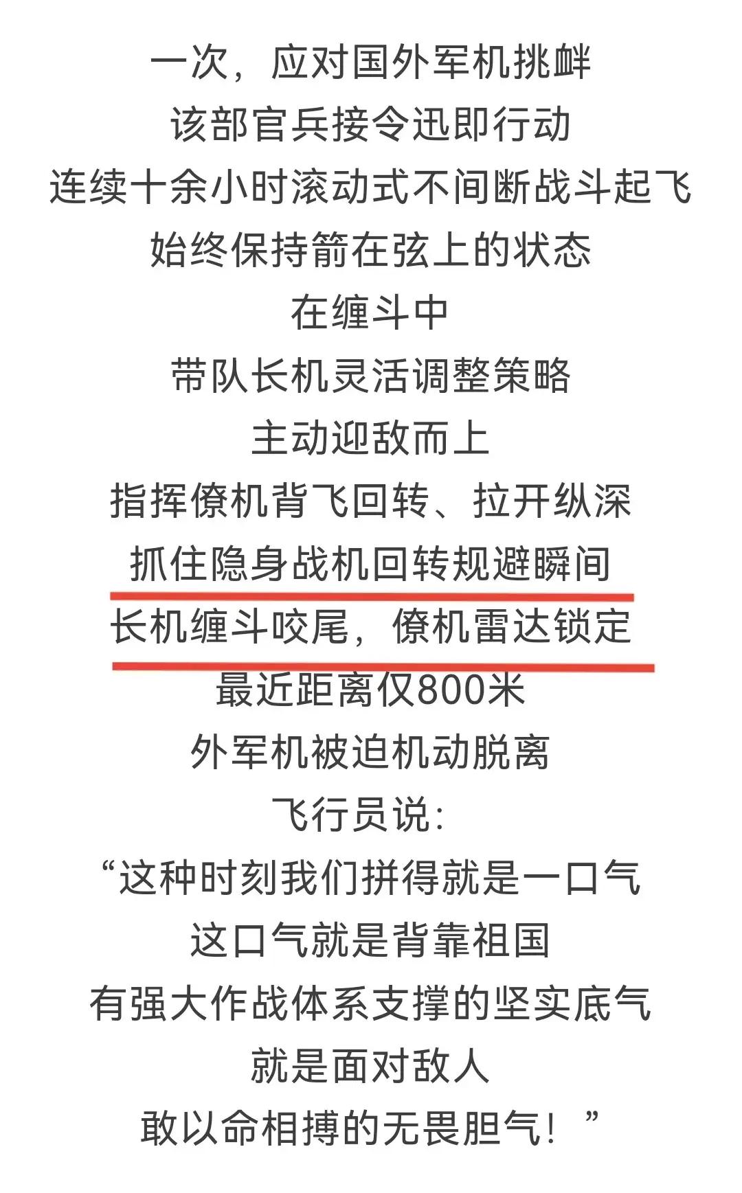 “海空雄鹰”奋勇迎敌:中国军人用血性和智慧捍卫国家尊严 在这个瞬息万变的国际局势中,国家的安全与尊严从未如此紧密相连。2月11日,一场精彩绝伦的空中较量再次彰显了中国人民解放军的实力与勇气。当天,“海空雄鹰团”的两架苏-30战斗机,在面对外军隐身飞机的挑衅时,展现出了令人震撼的战斗素养和顽强拼搏的精神。 这场对抗,不仅仅是一场简单的空中缠斗,更是一场关乎国家尊严和军人信仰的较量。面对强大的外军隐身飞机,解放军飞行员没有退缩,没有畏惧。他们以敏锐的战术意识和过硬的飞行技巧,展开了一场“生死较量”。长机与隐身飞机近距离缠斗,咬尾追击,僚机雷达锁定目标,形成了极具威慑力的战术组合。连续十余小时的滚动式战斗,彰显了我军飞行员的坚韧不拔和高度的战斗准备。 这场战斗中,最令人动容的是飞行员们的“拼一口气”的精神。在激烈的空中交锋中,长机灵活调整策略,主动迎敌,带领队伍展开攻势。而僚机则在背飞回转、拉开纵深的同时,精准锁定隐身飞机,形成“围猎”之势。最终,隐身飞机被迫机动脱离,显示出我军在高端空战中的强大实力。 这些战斗场景,犹如一幅激烈的战斗画卷,也深刻反映出中国空军的成长与蜕变。它告诉我们:国家的安全,离不开一线战士的血性与智慧,更离不开国家的坚强后盾。中国军人用血肉之躯捍卫国家尊严,用专业与勇气书写新时代的空中传奇。 这场空战不仅仅是一次军事行动,更是一种精神的传递。它激励着无数年轻人,去热爱、去守护这个伟大的国家。面对未来的挑战,只要我们有信心,有决心,有像这些飞行员一样的勇士,就没有克服不了的困难。 在这个时代,国家的强大需要每一个人的努力。我们应当向那些在空中奋战的英雄们致敬,也希望更多年轻人能从他们身上汲取力量,成为新时代的守护者。因为,只有当每个人都心怀责任,国家才能真正实现繁荣富强。 这场空中较量,远不止于一次战术的比拼,更是一场精神的洗礼。它让我们明白:在国家的安全线上,没有旁观者,只有无数像“海空雄鹰”一样的勇士,用生命守护我们的天空。未来的路上,让我们共同期待,更多的中国飞行员能够在空中书写属于我们的荣耀篇章。