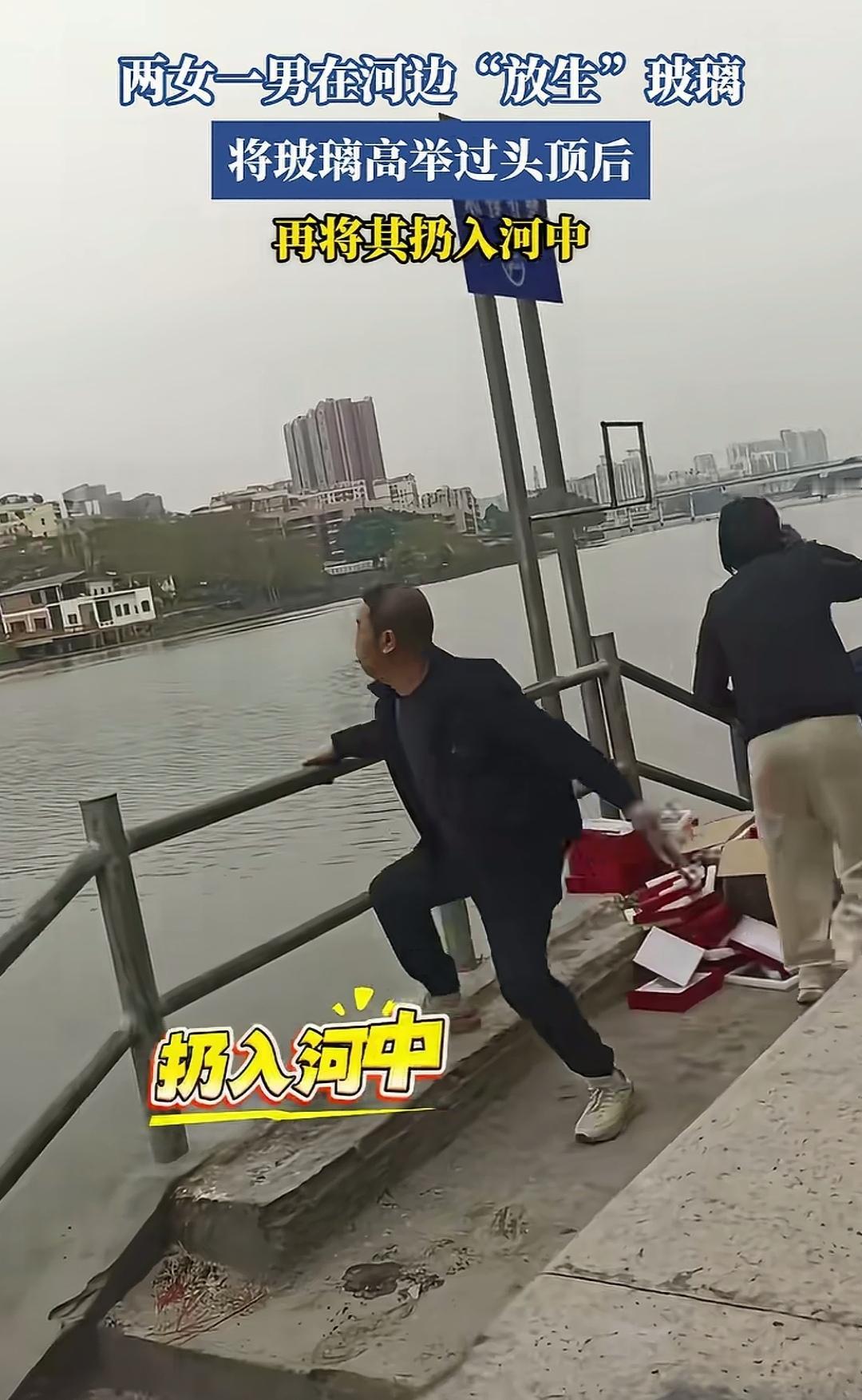 二女一男在江边疑似“放生”玻璃,视频一经上网,立刻引发网友对环保问题的热烈讨论! 近日,有网友发布视频称,2月10日,广东一处江边有二女一男疑似在“放生”玻璃。视频画面中,一名女子从一堆纸盒里拆出一个类似玻璃的物品,递给另一名女子。这名女子将这疑似玻璃的东西举过头顶,面向江面,好似在向江面祭拜,随后把手中物品传给身旁的男子,男子接过便直接扔入江中。 这一幕恰好被人用手机全程拍下,上传网络后,网友纷纷指责这三人破坏生态,认为这种“放生”违背伦理,不过是一种奇葩的自我安慰,并非真正意义上的放生。 至于这三人为何要把这些疑似玻璃的东西扔进江里,究竟有何目的,恐怕只有这三名当事人能给出解释了! 最后想问大家,你们是否知道他们这样做的具体目的?欢迎在评论区交流! 放生活动