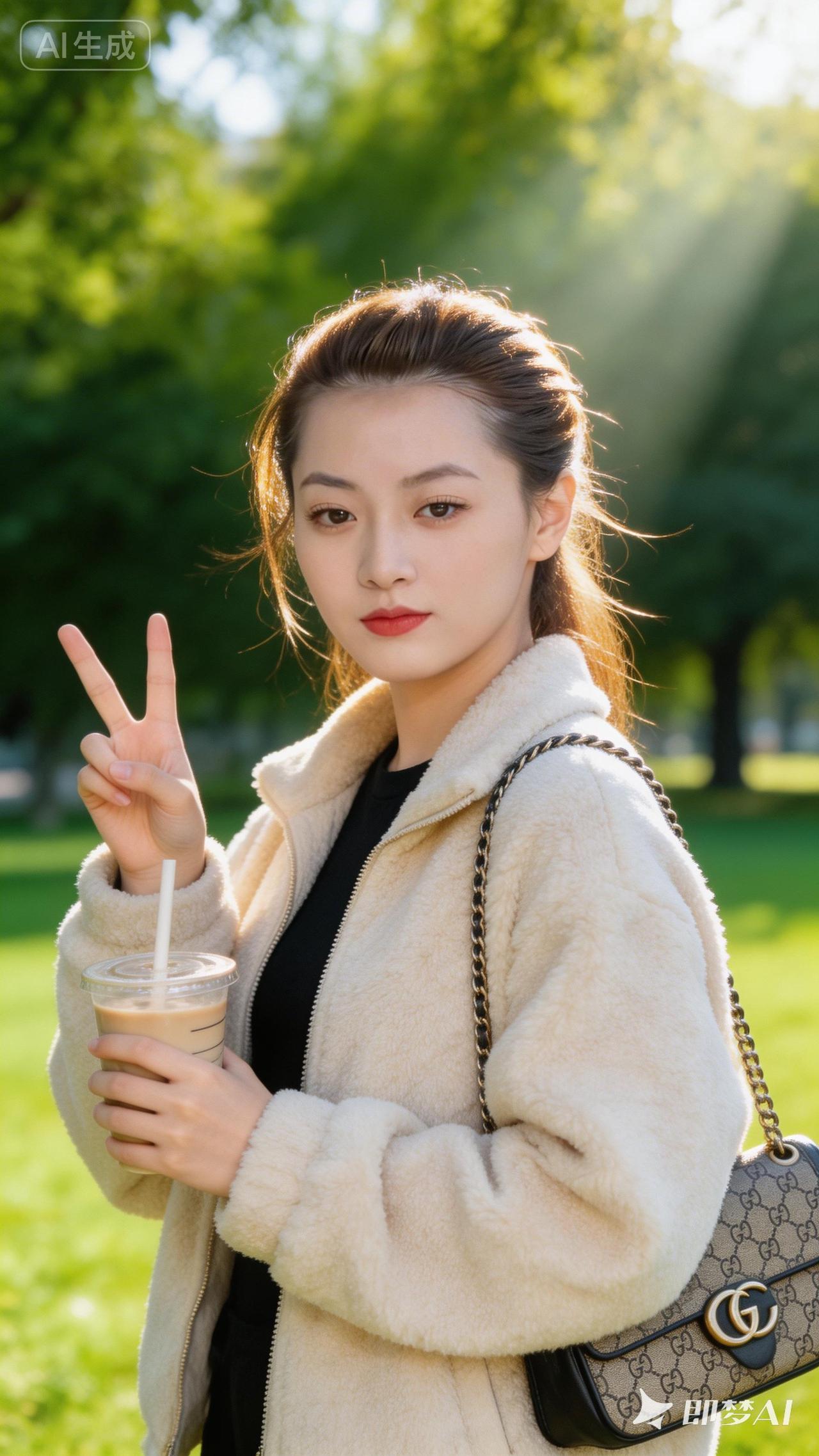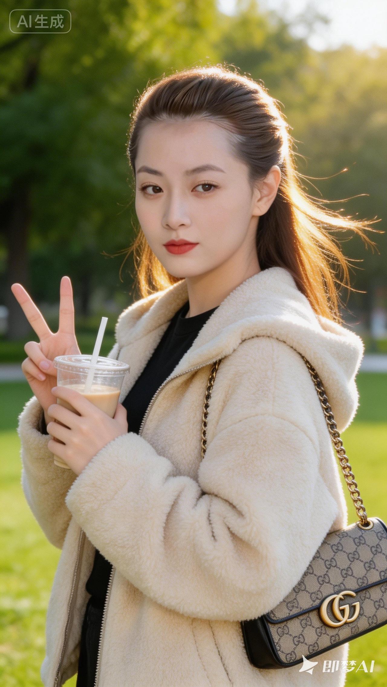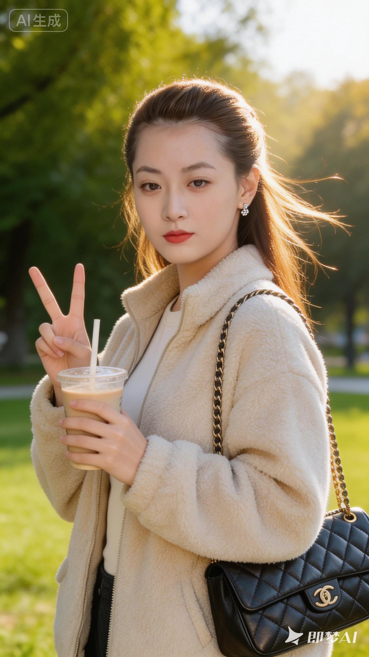 秋日暖阳下的时尚穿搭,手捧奶茶,轻松惬意。