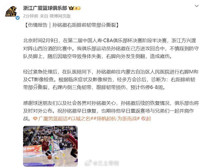 广厦官方通报孙总伤情:右距腓前韧带部分撕裂,右踝内侧三角韧带、跟腓韧带损伤,预计伤停6-8周。