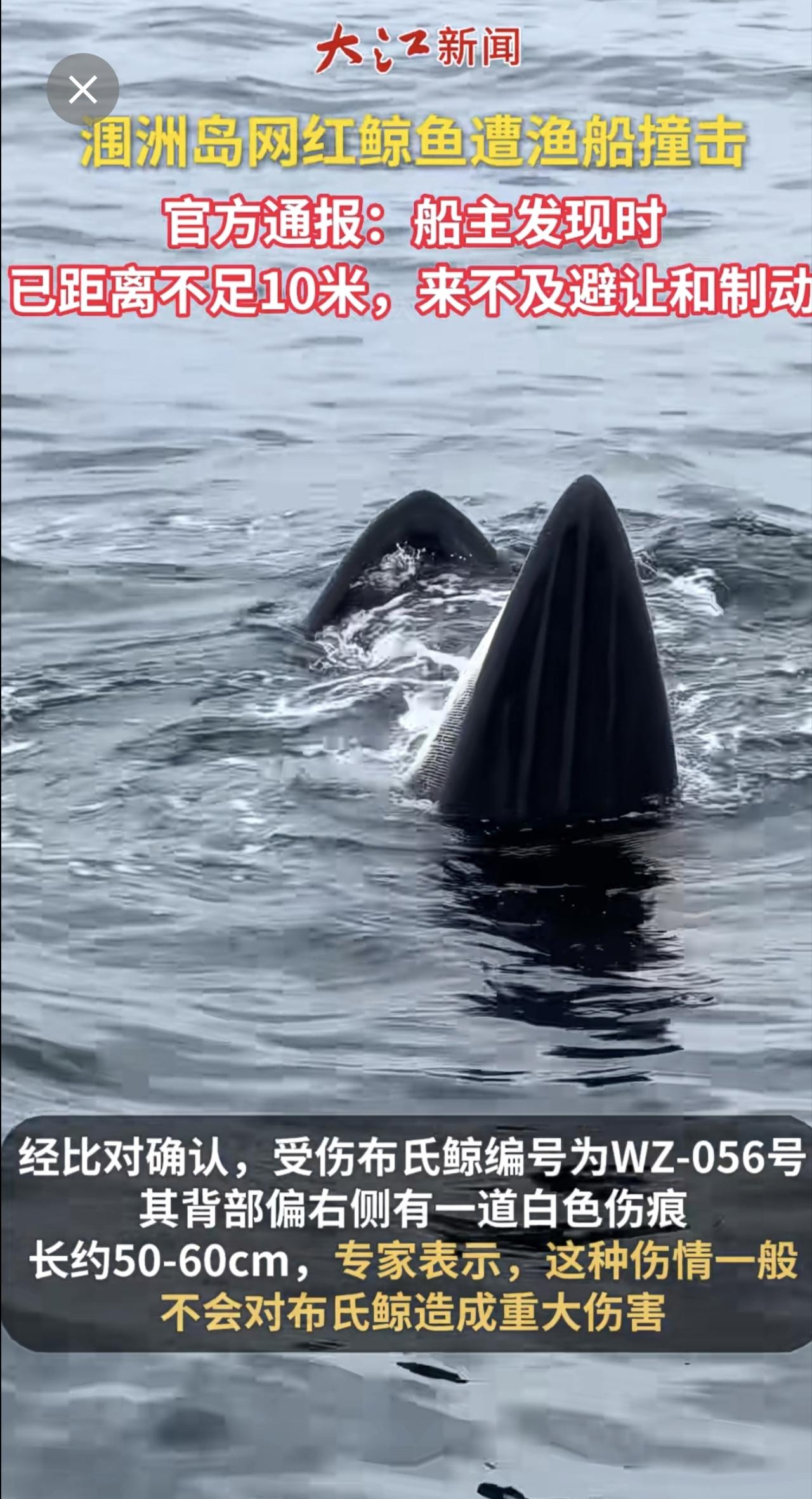 布氏鲸“刀疤哥”被渔船撞到,官方说暂无鲸鱼伤亡报告。根据有关规定,渔船或其他船