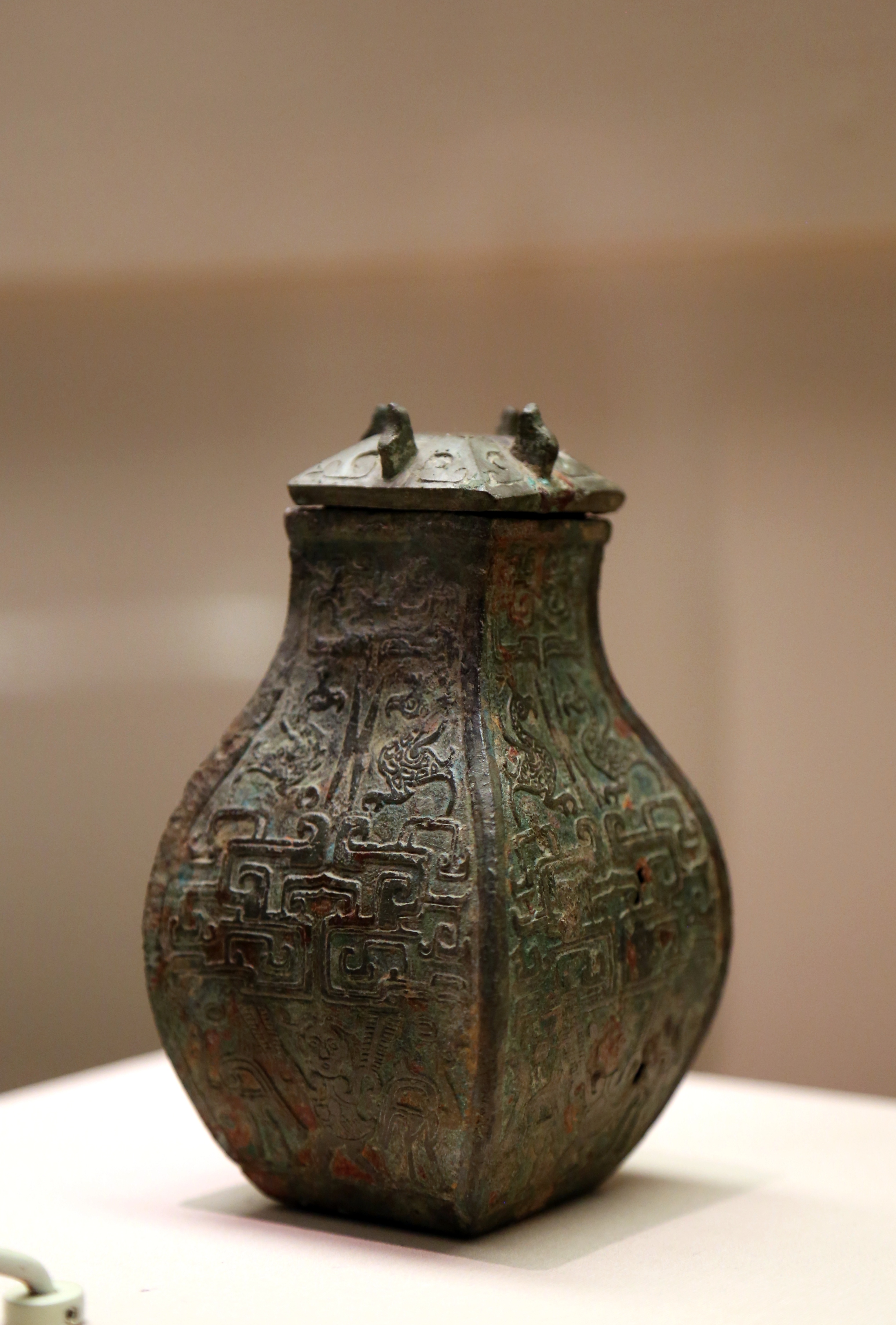 每天一件青铜器 山东临淄齐文化博物院藏临淄区国家新村工地出土战国时期:羽人纹高柄方豆. 出土时底部有残断,推测原本应有高柄.与 洛杉矶郡立博物馆的藏品(图2)应该是非常类似的.实际上二者的纹饰都几乎相同:有四层纹饰自上而下夔龙纹,X纹两侧各有凤鸟,再下面是复杂的勾连云纹,腹部则是羽人和鸟纹.