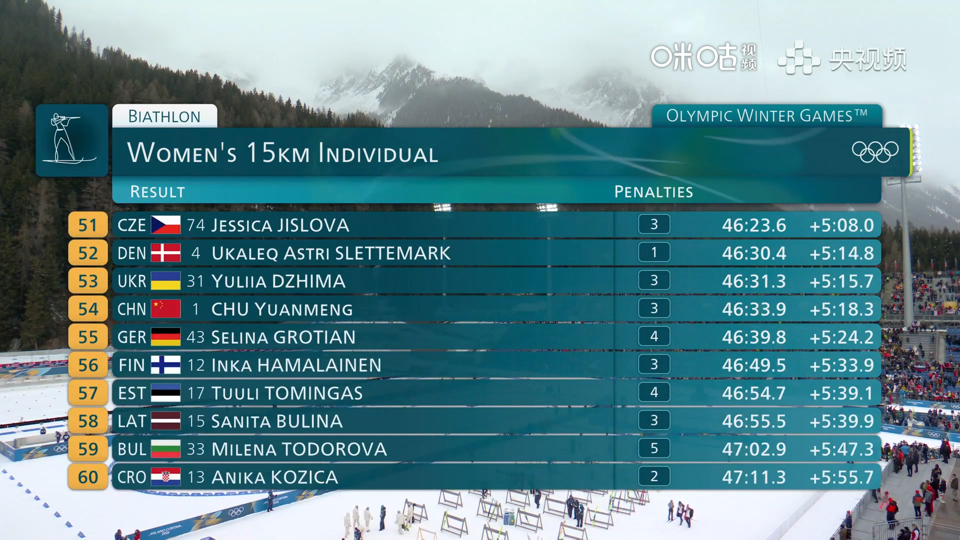 #褚源蒙孟繁棋冬季两项完赛# 米兰冬奥会冬季两项女子15公里个人赛选手全部完赛,中国选手孟繁棋总时间44:37.0,排名第26。褚源蒙总时间46:33.9,排名第54。法国选手朱莉娅·西蒙获得金牌,让蒙诺获得银牌,保加利亚选手赫里斯托娃获得铜牌。#看冬奥上咪咕#