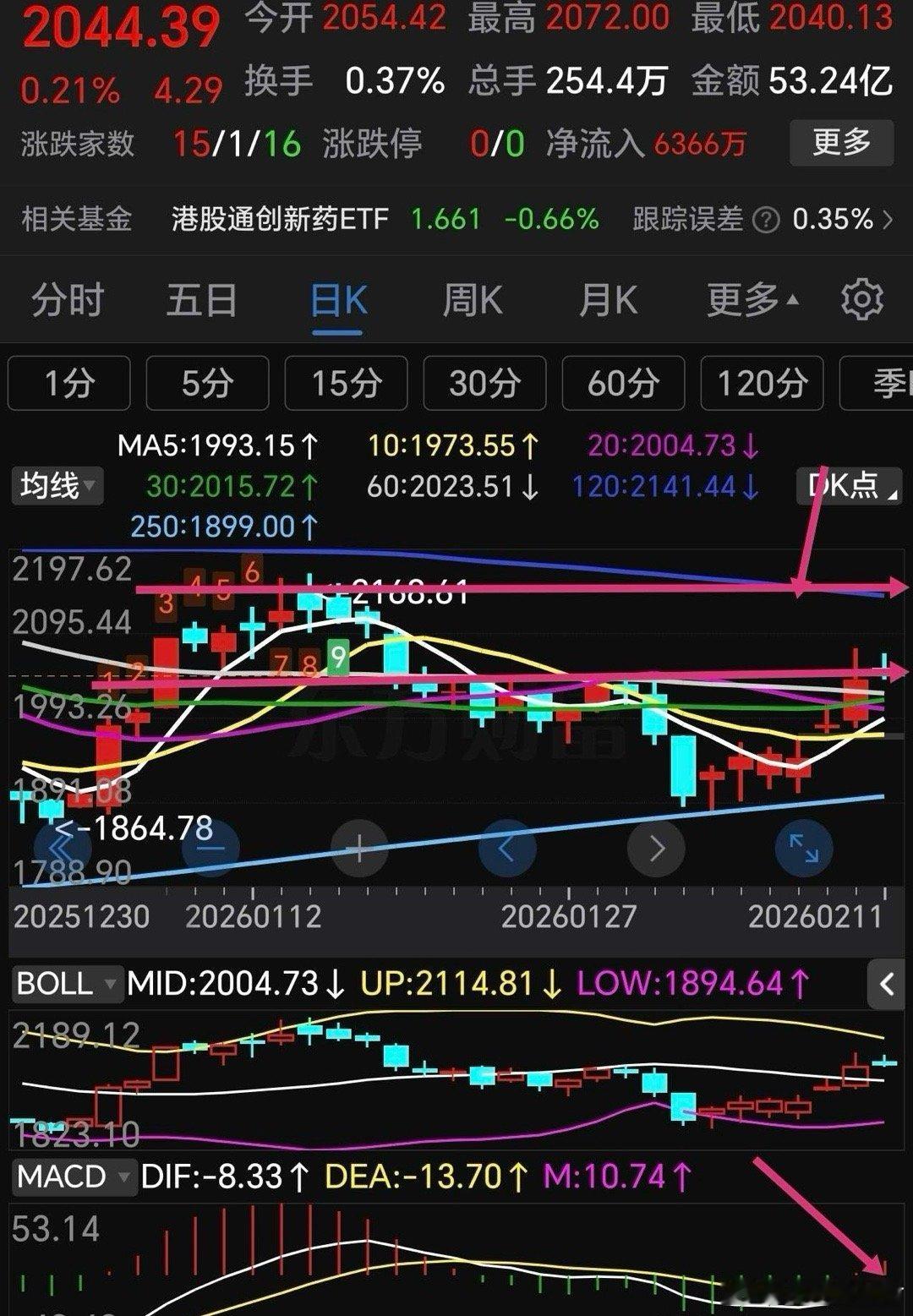 港股科技收盘涨0.71%港股通互联网涨0.85%港股通创新药涨0.21%恒生科技指数涨0.9% 港股通创新药macd刚刚金叉,今天冲高回落,是中途休息,明后天继续看涨。 恒生科技指数受阻于10日线压力,节前2天冲到年线压力位就差不多了,还有100个点,不到2%,剩下的就留给春节期间涨了。
