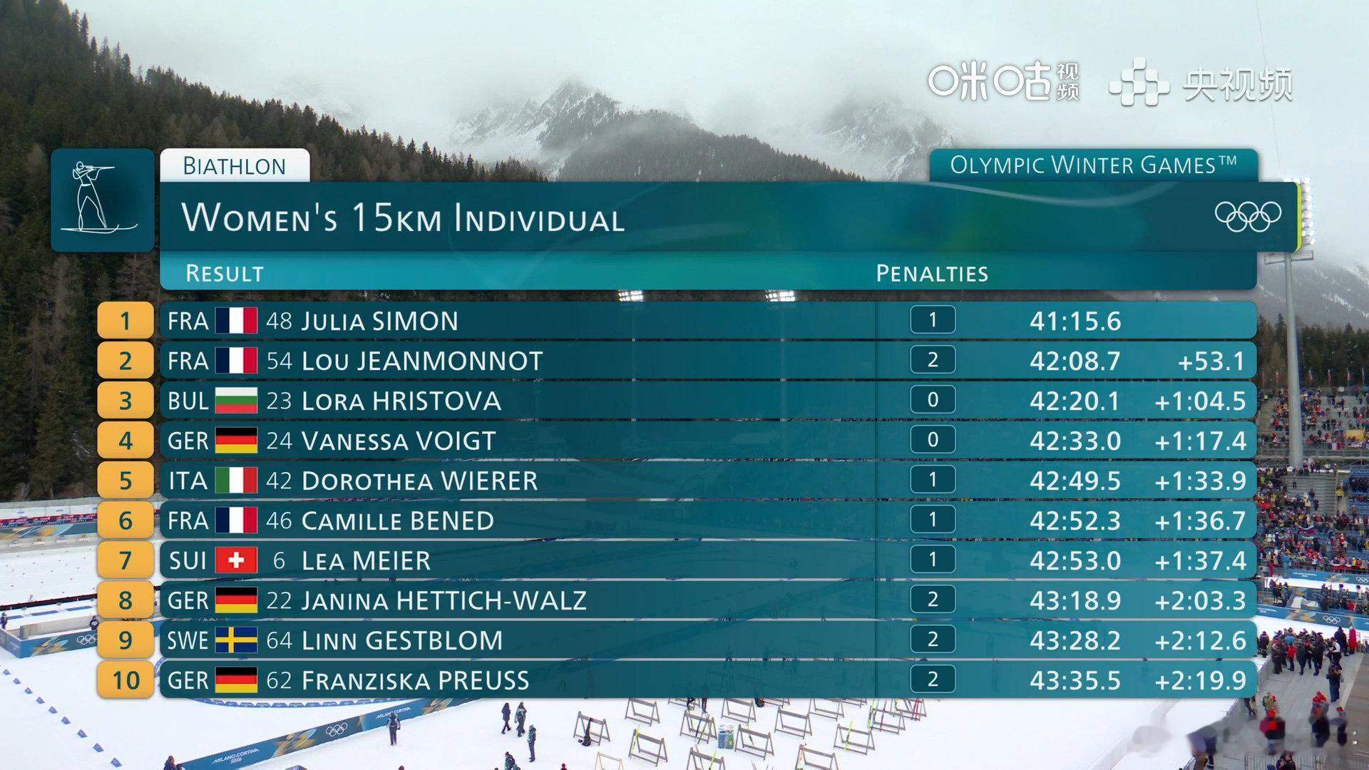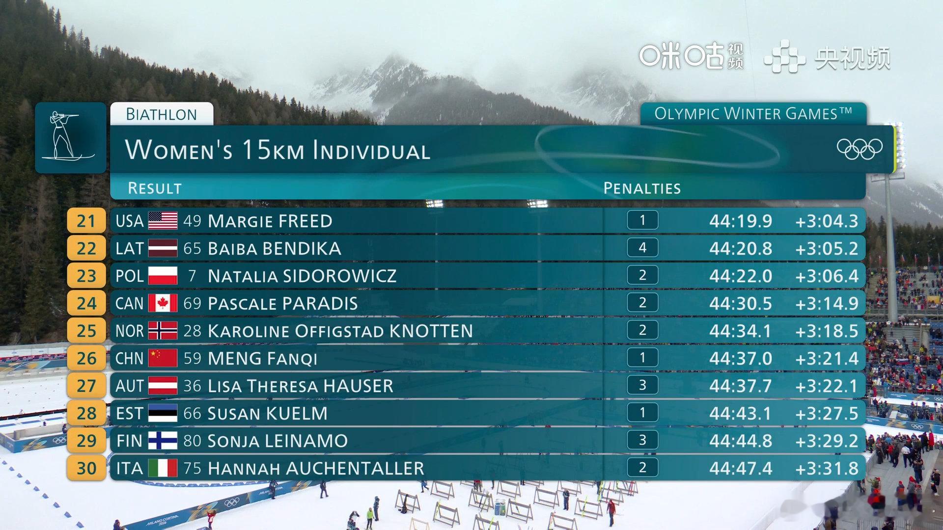 褚源蒙孟繁棋冬季两项完赛 米兰冬奥会冬季两项女子15公里个人赛选手全部完赛,中国选手孟繁棋总时间44:37.0,排名第26。褚源蒙总时间46:33.9,排名第54。法国选手朱莉娅·西蒙获得金牌,让蒙诺获得银牌,保加利亚选手赫里斯托娃获得铜牌。
