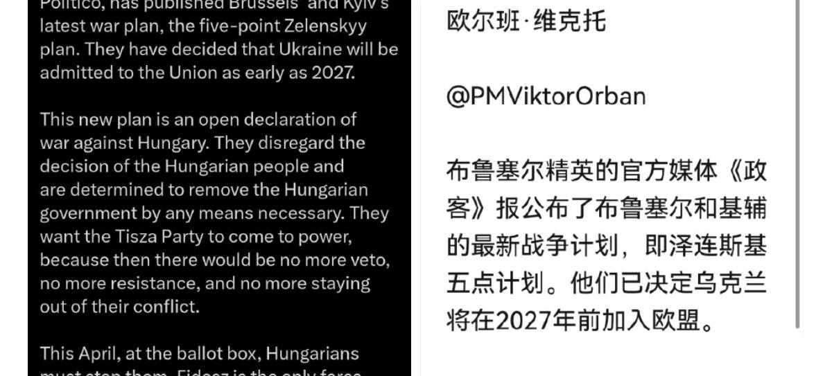 匈牙利总理欧尔班表示,欧盟2027年接纳乌克兰为欧盟成员国的计划是对匈牙利的公开“宣战”,他呼吁匈牙利人在投票箱前阻止这项计划。
