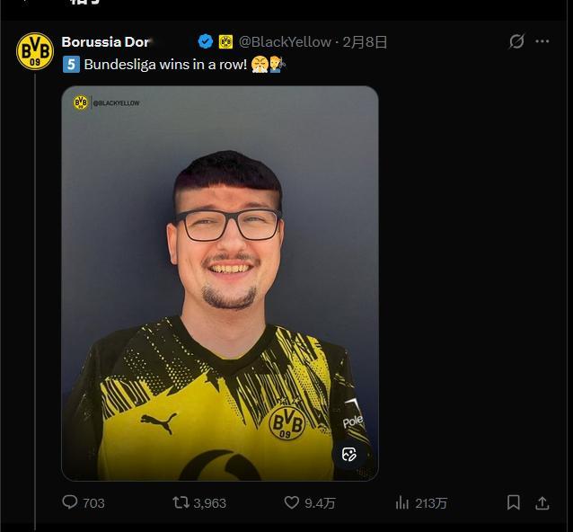 2月8日发文:我们5连胜了。然后P了穿多特的蓄发哥理短发