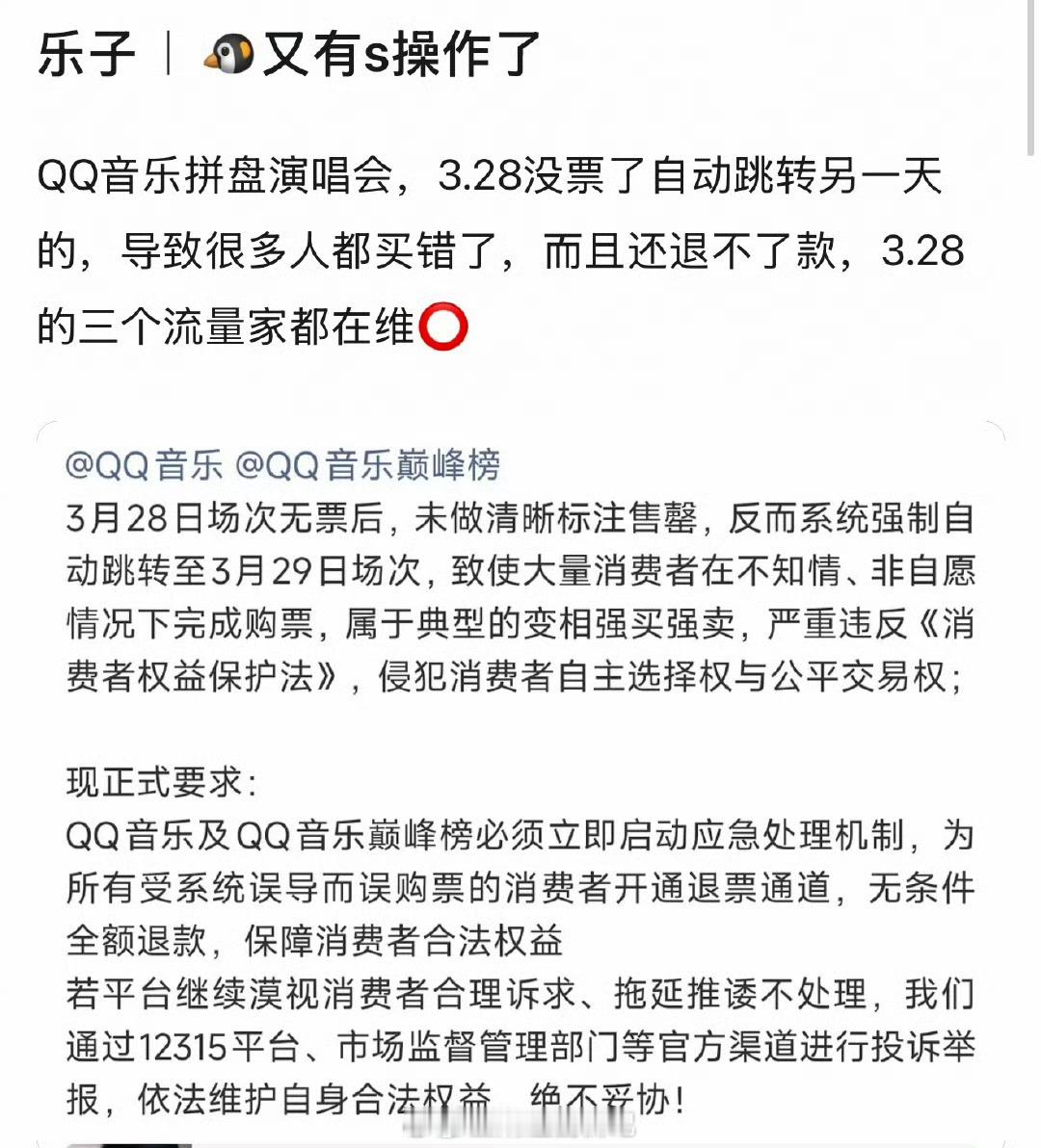 第一次看到三家联合维权的,QQ音乐这波操作确实让人惊讶。王俊凯、鞠婧祎、丁禹兮粉丝买28号的票看自己偶像因为无票跳转29号的票,买票时看不到时间买完发现时间不对还不退款。