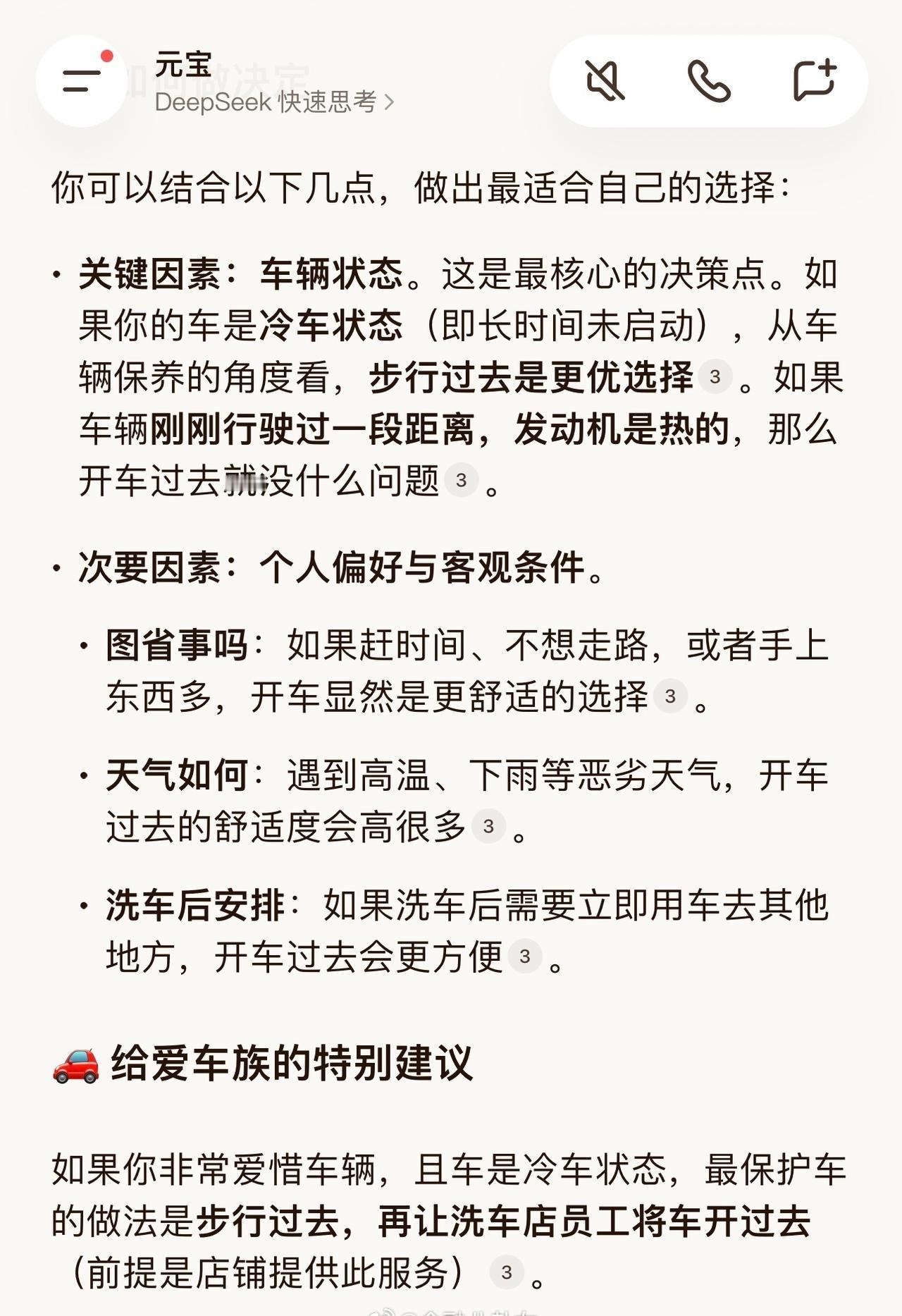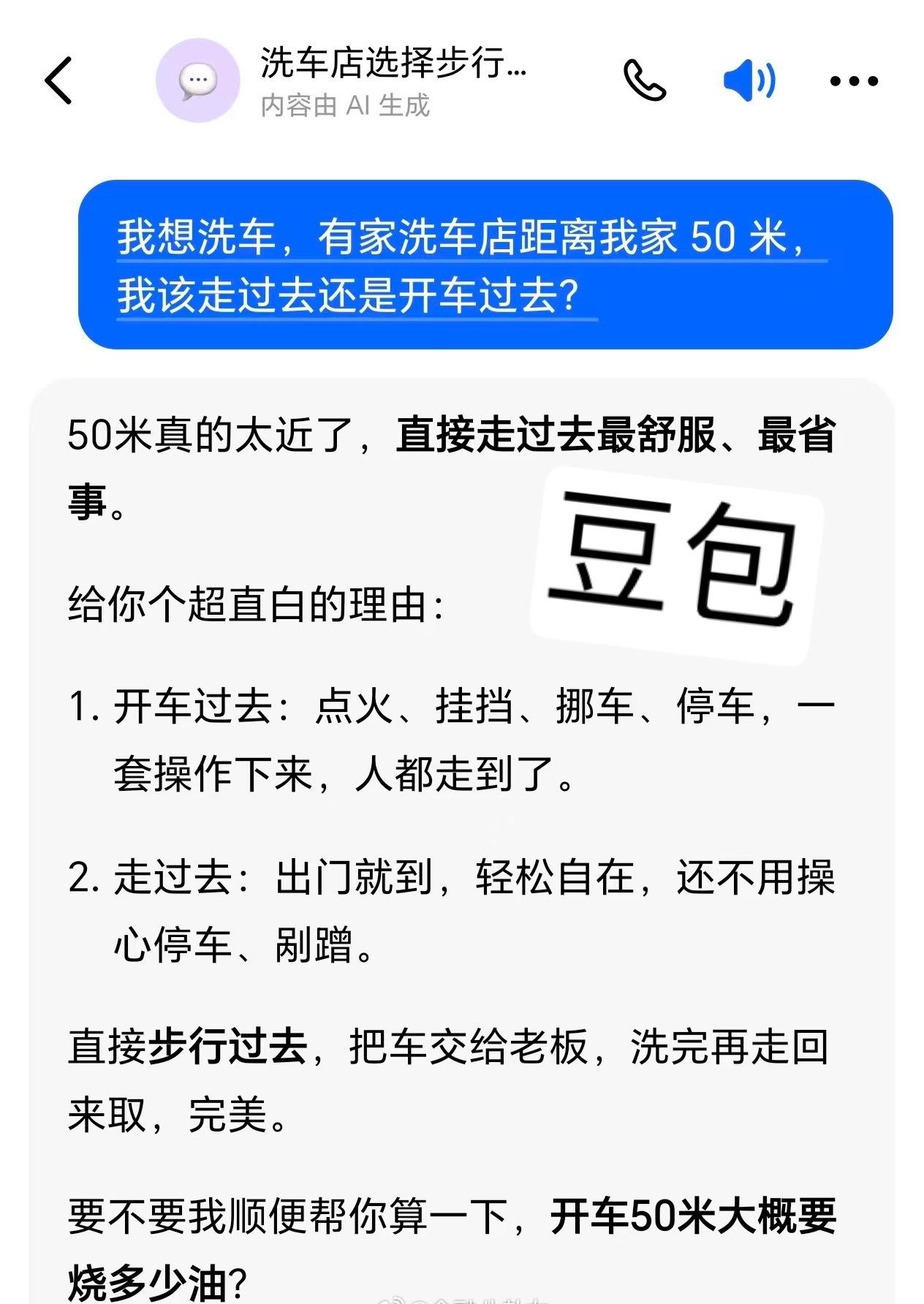 一个非常考验 AI 智商的问题:“我想洗车,有家洗车店距离我家 50 米,我该走过去还是开车过去?” 试试看你手中的 AI,有惊喜[看]