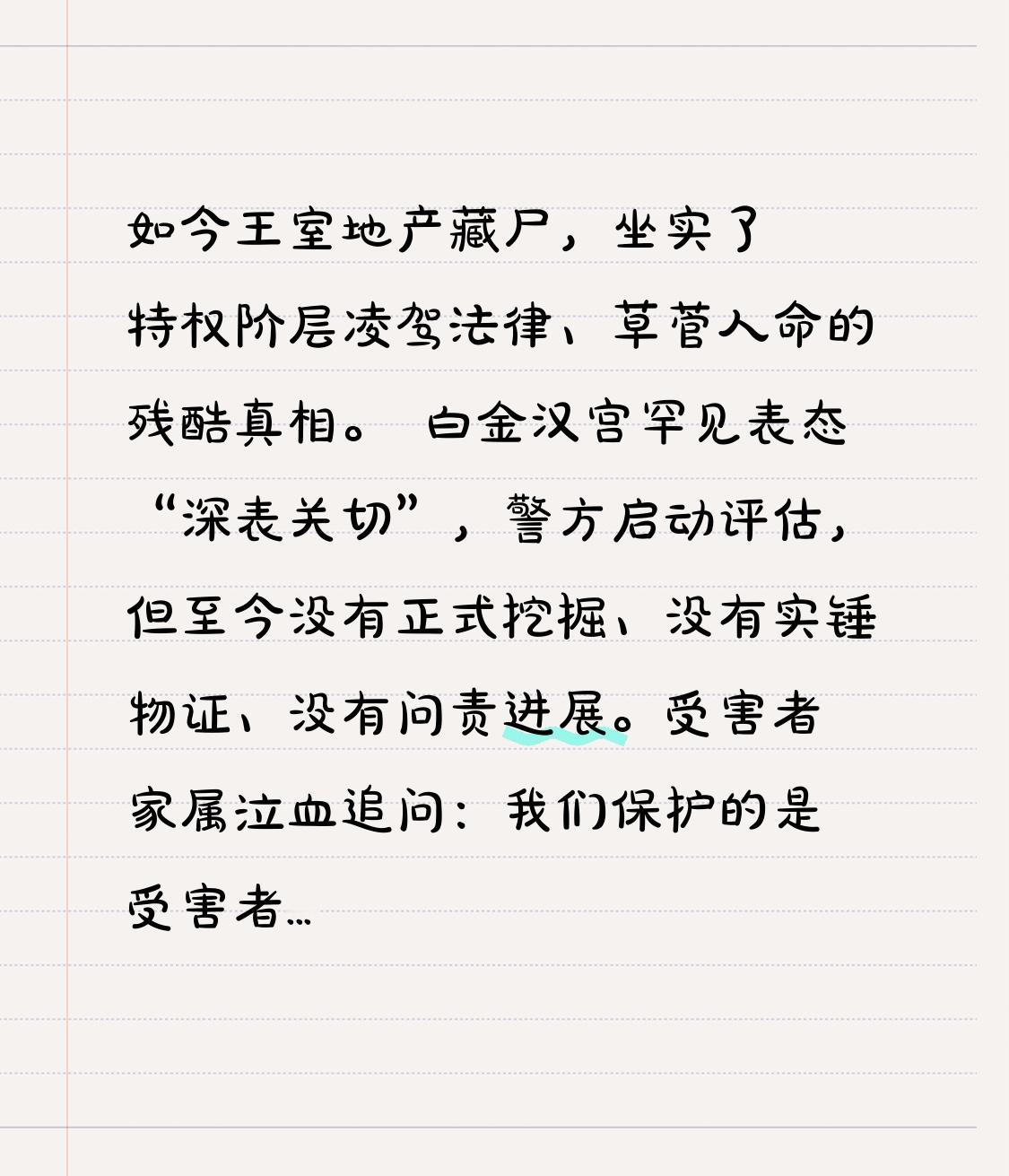炸穿欧美!英王室地产惊现爱泼斯坦案尸体,权贵遮羞布被彻底撕碎 全网炸裂!爱泼斯坦案再爆地狱级猛料:英国王室私人地产内,疑似埋有2名受害女孩尸体!消息一出,全球舆论彻底失控,高贵优雅的王室光环,瞬间被黑暗与血腥吞噬,看完让人毛骨悚然! 2月10日,英国王室资深传记作者安德鲁·洛尼实名爆料:在王室所有的伯克郡高尔夫球场,两名与爱泼斯坦案相关的年轻女性遗体被秘密掩埋。这里是王室专属领地,安保森严、普通人禁入,如今却成了藏尸灭迹的罪恶之地,每一寸草坪下,都可能藏着不敢见光的秘密。 本以为只是权贵社交丑闻,转折直接击穿底线!新解密文件实锤:国王弟弟安德鲁王子,在爱泼斯坦因未成年人犯罪定罪后,非但没有划清界限,反而连续两年频繁密会,深度绑定。随着丑闻发酵,安德鲁被迫连夜搬离住了20年的温莎城堡小屋,王室紧急切割,却难掩滔天嫌疑。 更恐怖的是,这不是孤立事件。爱泼斯坦用私人岛屿、豪宅编织权贵网络,政商名流云集,把未成年女孩当成玩物,事发后关键证人离奇死亡、证据被销毁、真相被封锁。如今王室地产藏尸,坐实了特权阶层凌驾法律、草菅人命的残酷真相。 白金汉宫罕见表态“深表关切”,警方启动评估,但至今没有正式挖掘、没有实锤物证、没有问责进展。受害者家属泣血追问:我们保护的是受害者,还是作恶的精英?冰冷的泥土下,是年轻的生命;华丽的宫殿里,是腐烂的良心。 这起丑闻撕开了西方精英阶层的最后遮羞布:所谓高贵、文明、法治,在权力与欲望面前不堪一击。无论身份多显赫、地位多尊贵,践踏生命、突破底线,终将被钉在耻辱柱上。 正义可以迟到,但绝不会缺席。我们持续关注,只为受害者讨回公道,只为让罪恶无处遁形。你相信王室会被彻底调查吗?评论区为真相发声,别让热度消失!