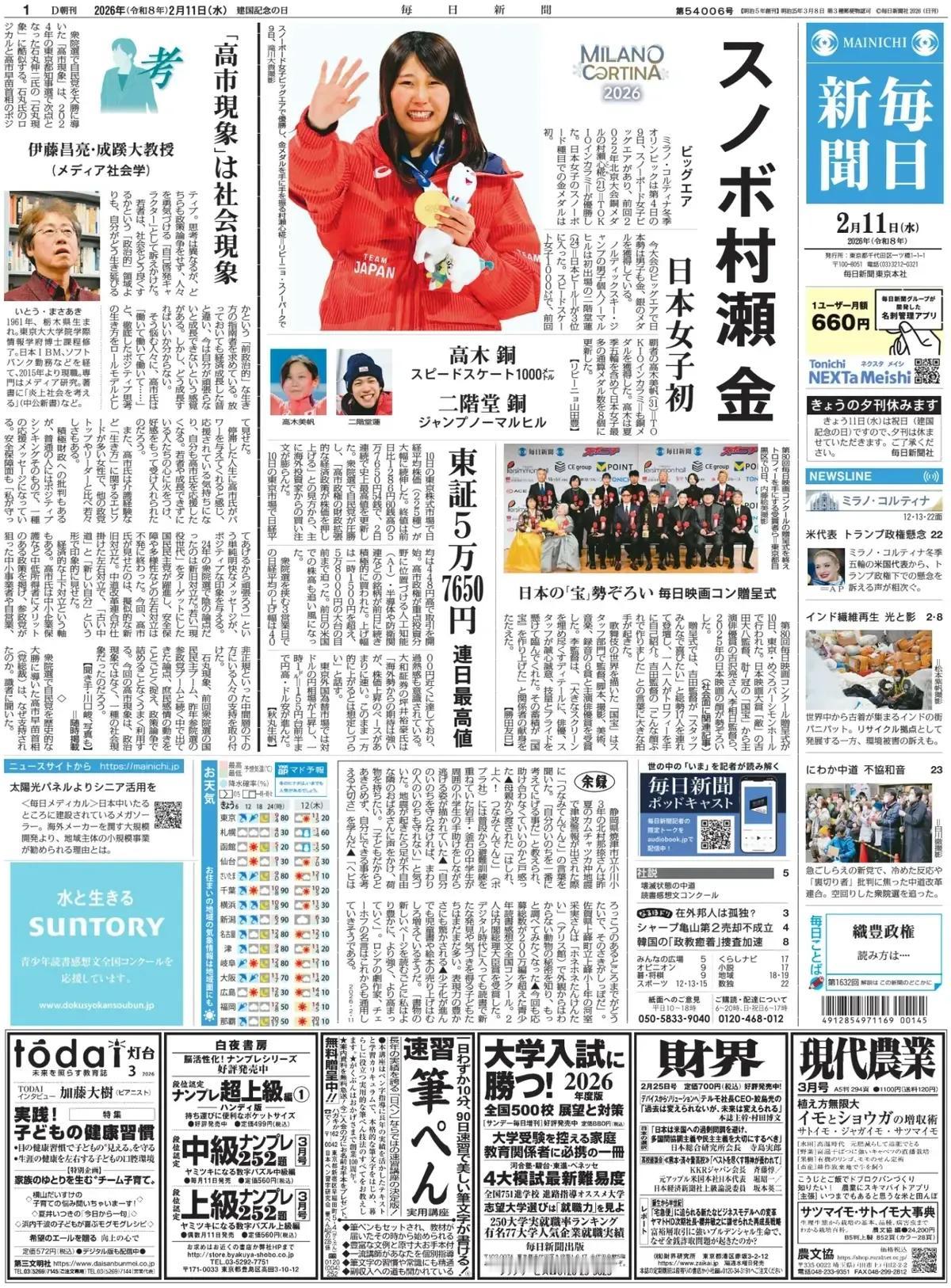 《每日新闻》头版报道称,在因日本选手的获取奖牌狂潮而沸腾的米兰-科尔蒂纳冬奥会上