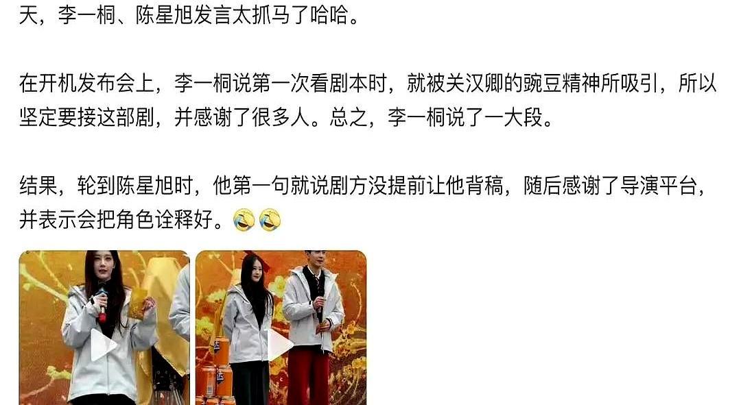 陈星旭对着话筒说:“来之前,没人通知我背稿。” 现场空气瞬间凝固。李一桐脸上的笑容收起,转头看向他。这句话十分钟后冲上热搜,被解读成对女方详尽发言的微妙讽刺。网友吵翻了天,一方骂他情商低,一方赞他真性情。 开机前,双方粉丝早已因番位撕过一轮。官宣时,陈星旭团队零点四十一分率先发布,李一桐团队一点二十六分跟上,解释是因“不可抗力”提前告知。这根刺,在开机仪式上终于见了血。 所以,开机发言到底该提前准备万无一失,还是该临场发挥真实流露?