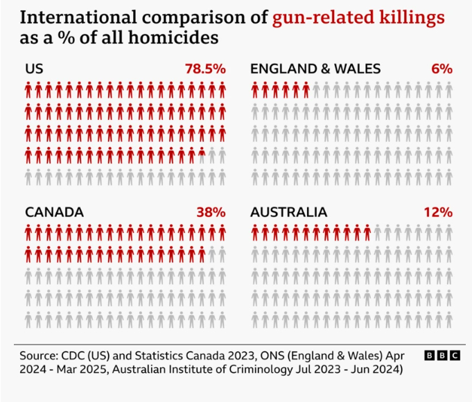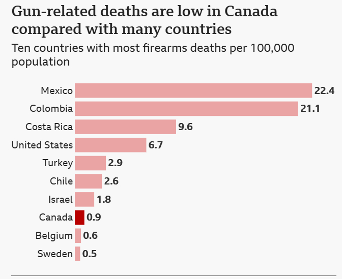根据最新统计,加拿大的枪支杀人率高于英格兰和威尔士,但远低于美国。