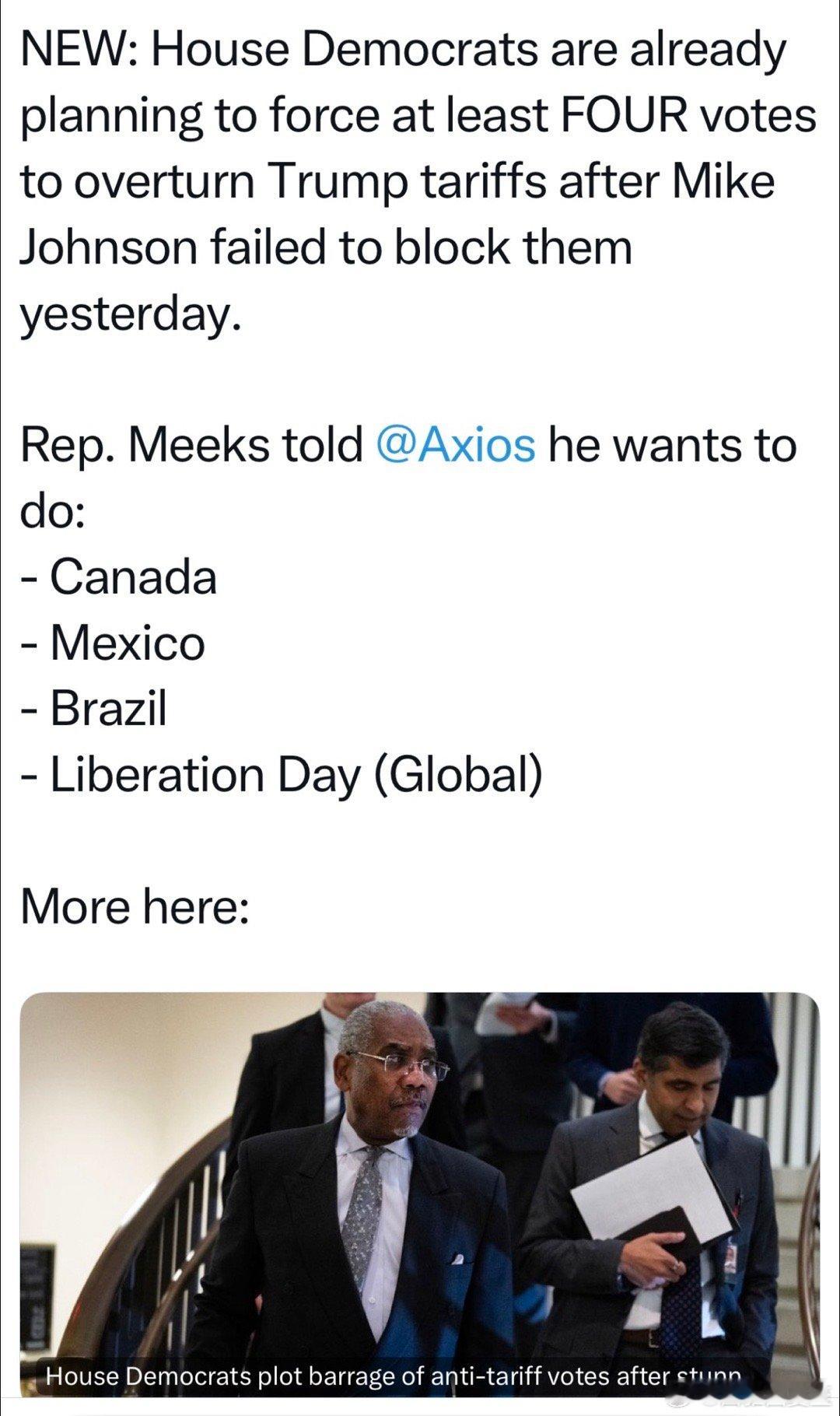 民主党认为,已有足够支持,可以进行四项表决:投票推翻对加拿大、墨西哥、巴西的关税,以及“全球对等关税”