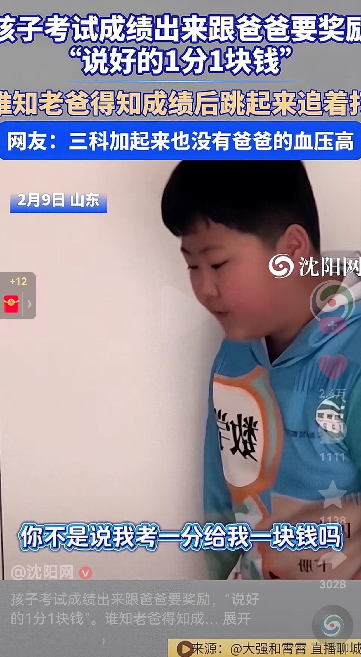 这孩子胆子不小,考这点分数,不挨打都够好的了,还想着要奖励。到底是怎么想的?2月9日,山东,一男孩的期末考试成绩出来了,当时男孩的爸爸正在睡觉,儿子突然记住爸爸对他的承诺了。 于是,他攥着成绩单,凑到床边喊爸爸起床,只见男孩说:“爸,我期末成绩出来了,你不是说考1分给1块钱吗?” 听到儿子的呼唤,老爸被吵醒了,迷迷糊糊翻个身,询问儿子:“考多少分啊?” 男孩说:“98分!” 老爸听到98分,觉得成绩还不错,眼睛都没睁就回答:“哦,挺好,我睡醒给你100。” 老爸继续问:“你哪一门考98分呢?” 男孩犹豫了三秒,开始回答:“一共98分,三门加在一起,一共98分。” 听到这里,老爸瞬间睡意全无,直接从被窝里弹起来,抄起拖鞋就追:“你给我站住!三科加起来98,你还好意思要奖励?!” 网友看到后评论说: “我家娃上次考了全班倒数第三,我跟他说‘没事,下次努力’,转头就躲在厕所里哭。” 也有的网友说:“我跟我儿子说考多少分都没关系,可看到成绩单的那一刻,还是忍不住血压飙升。” 还有的网友说: “我们总说不要唯分数论,可当孩子拿着成绩单站在面前,还是会忍不住焦虑,怕他输在起跑线上。” 作为家长,好像我们都活在一种矛盾里:一边说着快乐教育,不给孩子压力,一边又忍不住拿孩子跟别人比。一边告诉孩子“尽力就好”,一边又在看到分数时,把焦虑写在脸上。 就像视频里的老爸,前一秒还说“睡醒给你100”,后一秒就追着孩子打。 我们总在焦虑孩子的未来,却忘了,他们的现在,才是最珍贵的。 它可能是三科加起来98分的“小糊涂”,可能是考了双百却把奖状折成纸飞机的“小调皮”,可能是明明很努力却还是没进步的“小笨蛋”。 可这些不完美,才是他们最真实的样子。 我们总说要给孩子最好的,可最好的教育,从来不是分数,而是接纳。接纳他们的不完美,接纳他们的慢节奏,接纳他们就是一个普通的小孩,然后陪着他们,一起慢慢长大。