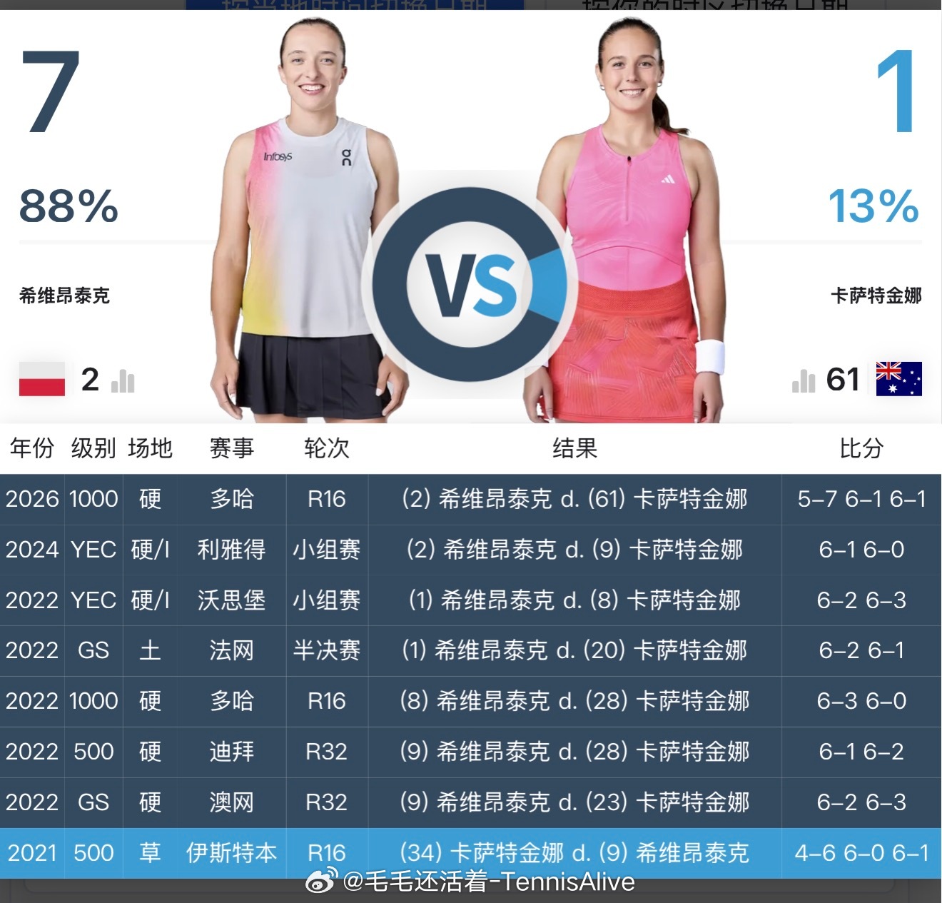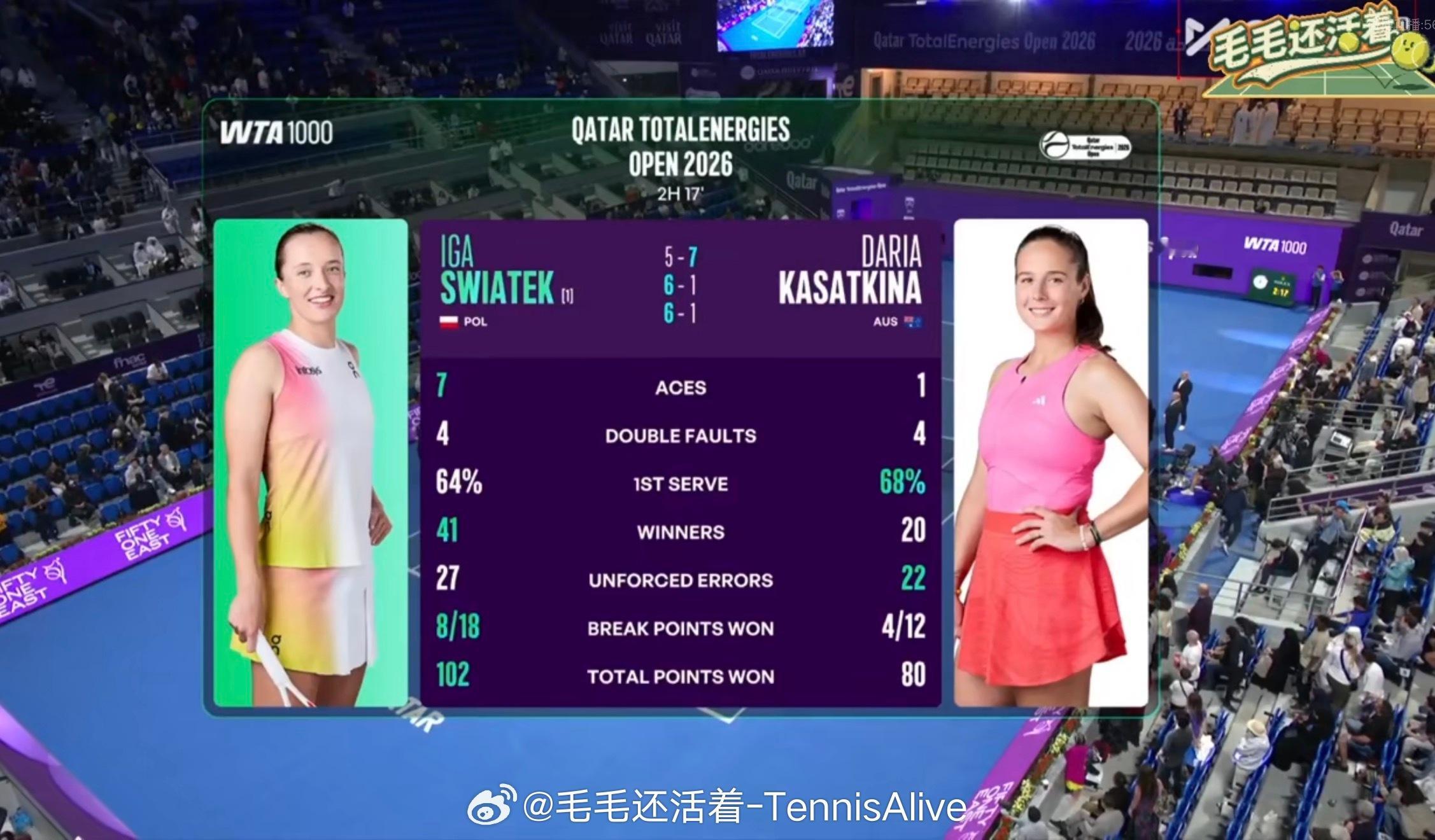 这场比赛第一盘斯瓦泰克起伏非常大。很多球的击球点都没找准,可能有风的原因,打的也急了一些。卡萨金娜也打得不错,击球很稳定。第二三盘,斯瓦泰克迅速调整,找回了自己的状态,7连胜卡萨金娜。