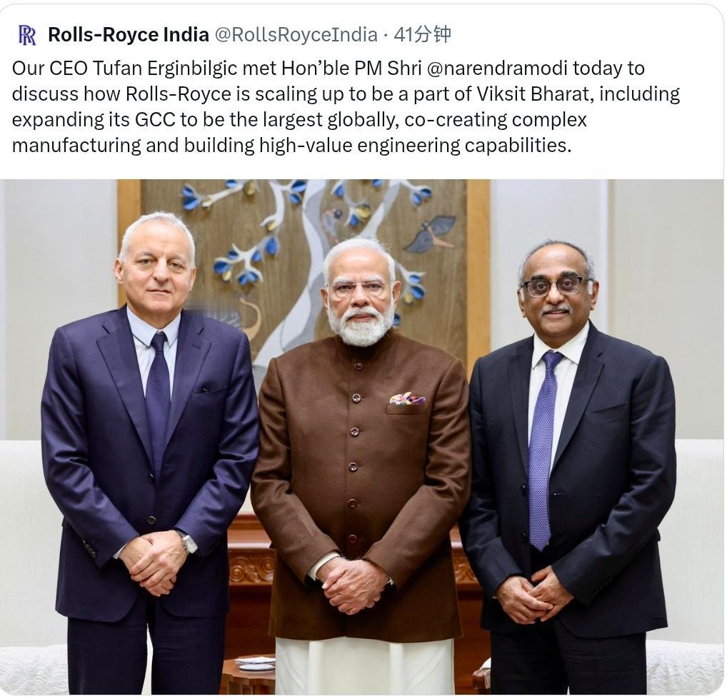 莫迪:今天早些时候很高兴见到劳斯莱斯首席执行官图凡·埃尔金比尔吉奇先生。 我们欢迎劳斯莱斯对扩大在印度的业务规模以及与我们富有创新精神和活力的年轻人合作的热情。